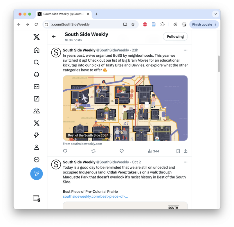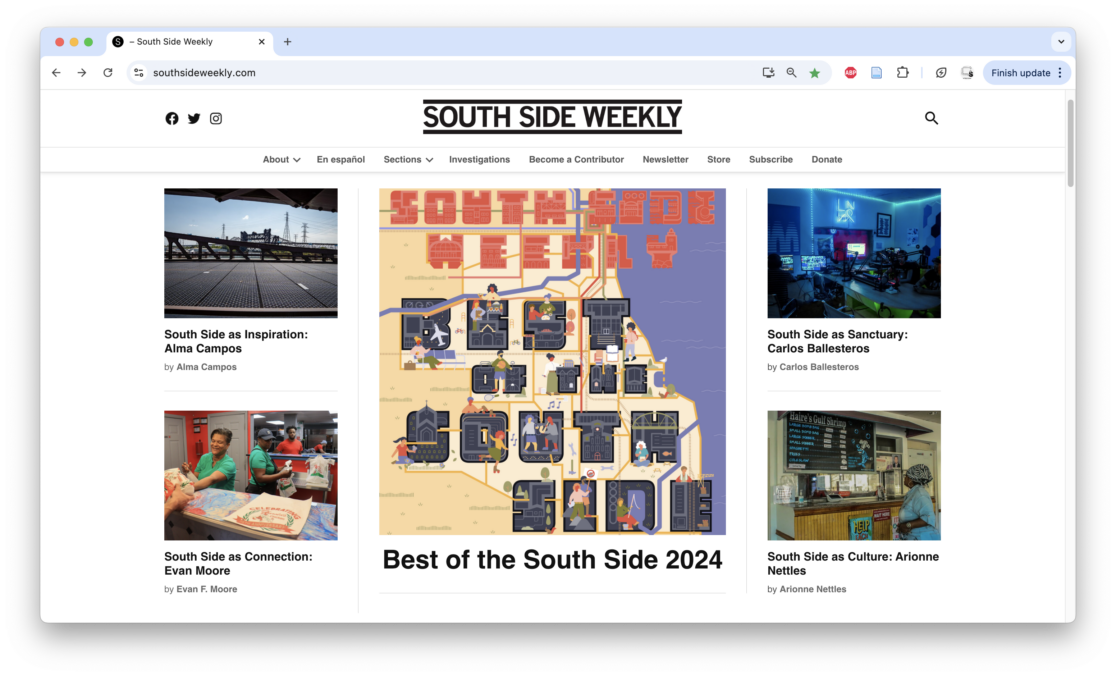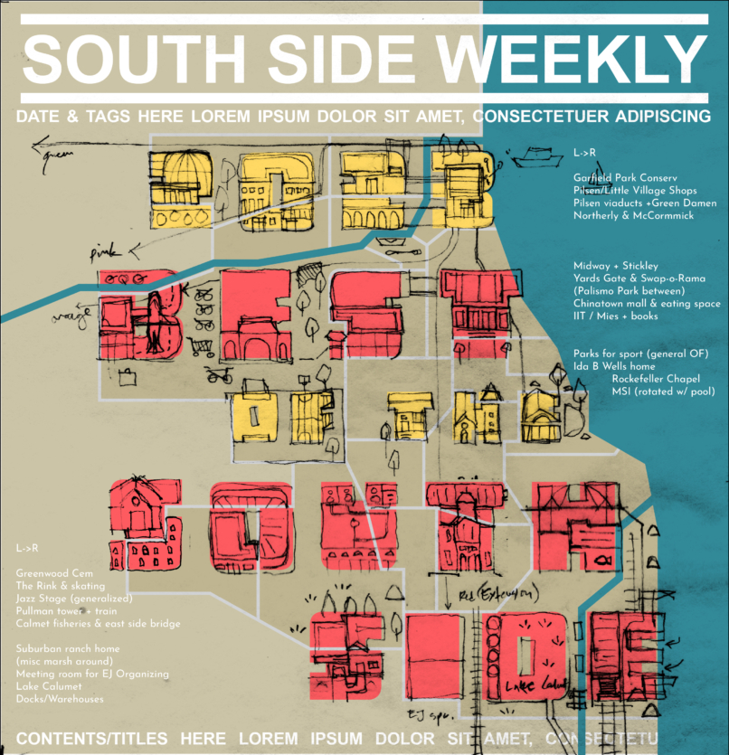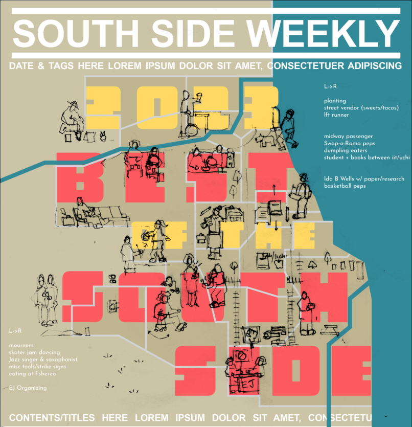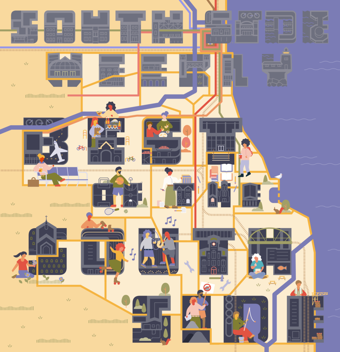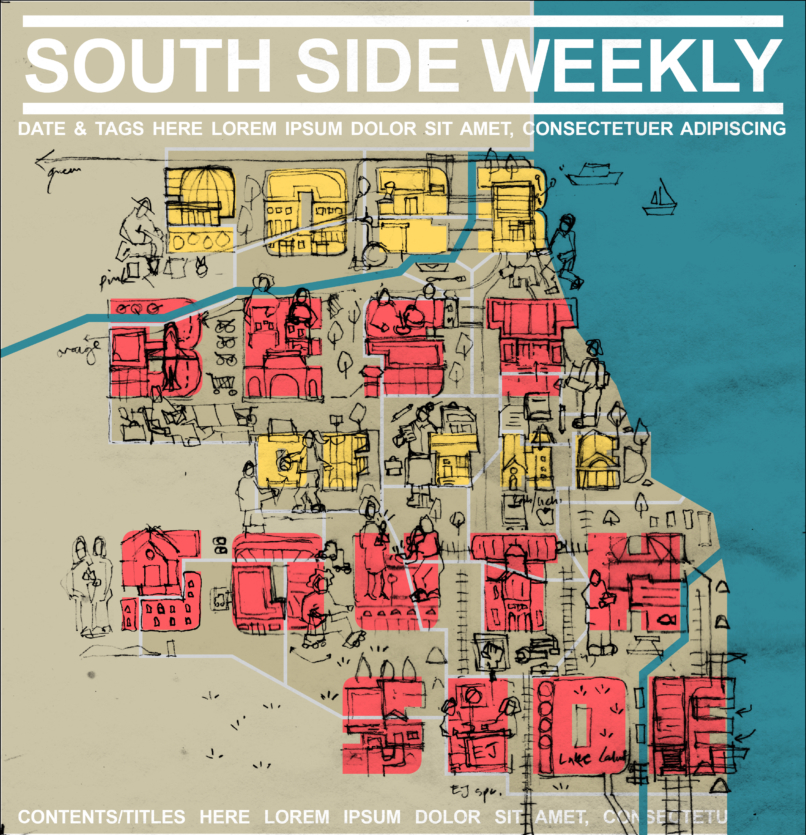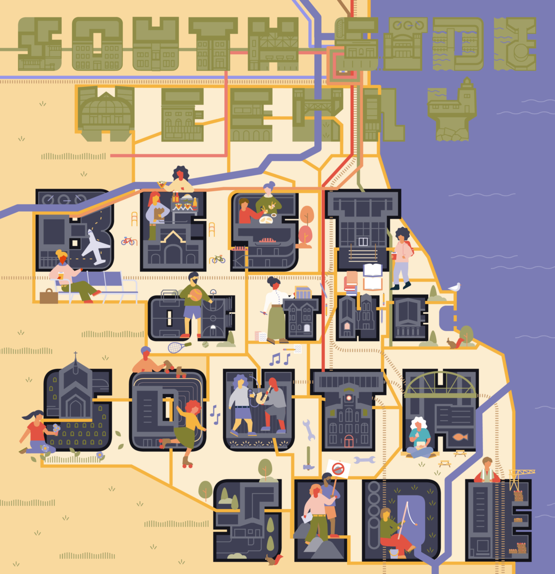 This South Side Weekly cover for ‘Best of the South Side’ (September, 26 2024) features an abstracted Chicago map of south side communities. The feature text acts as buildings, with associated occupants, highlighting some of the iconic locations, events, and activities nominated by SSW readers and contributors.
