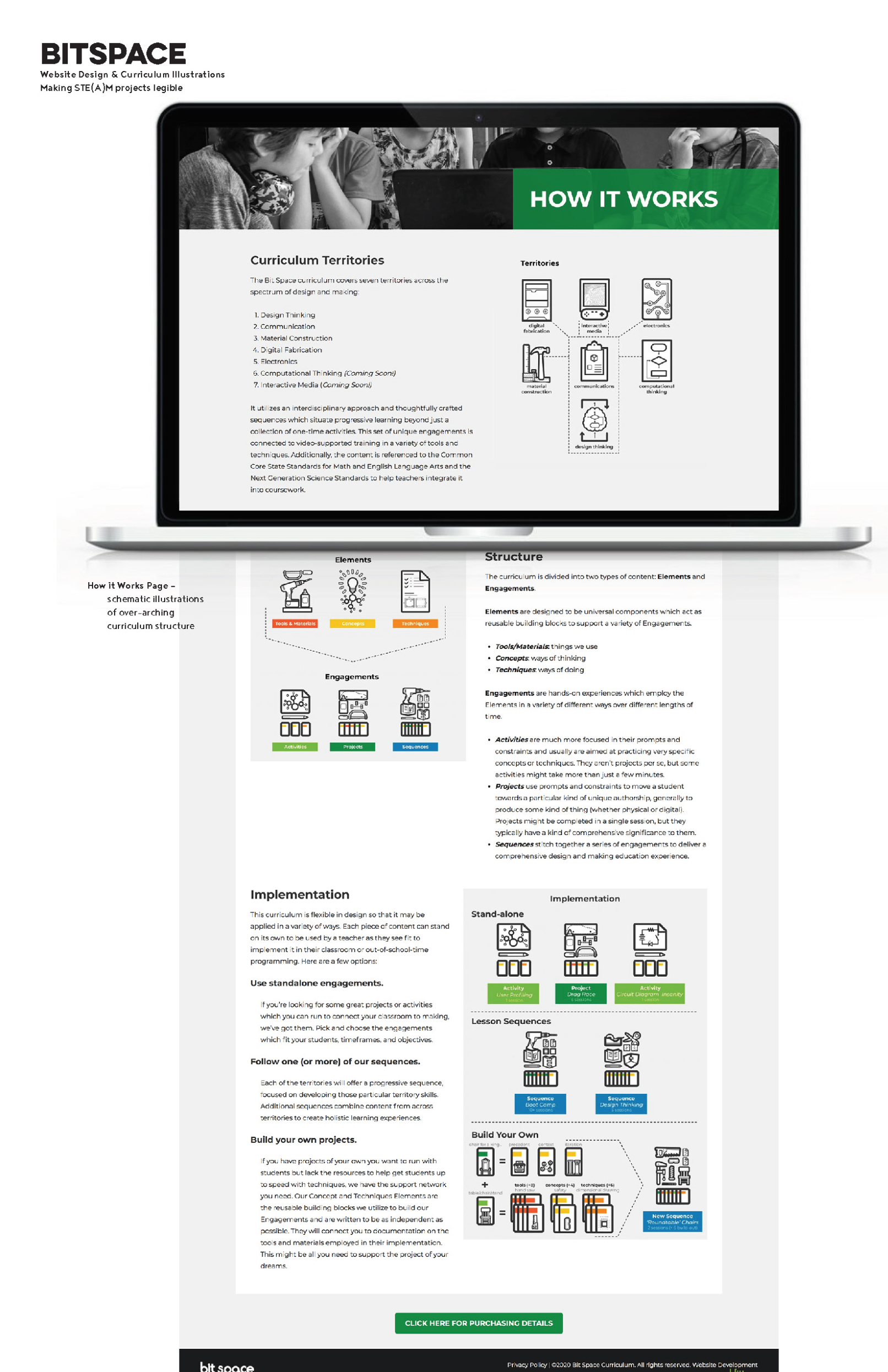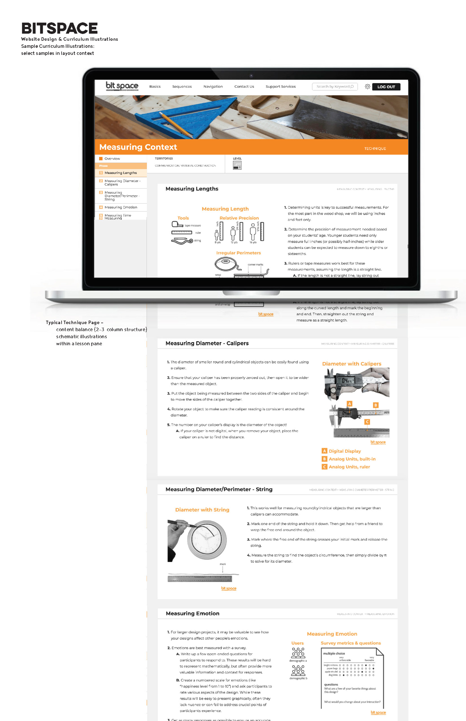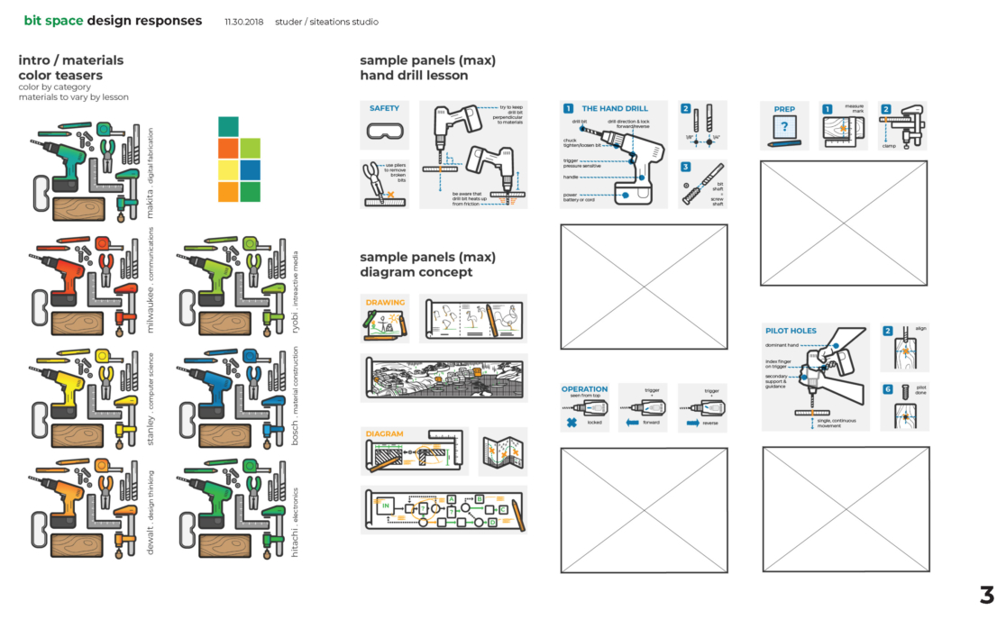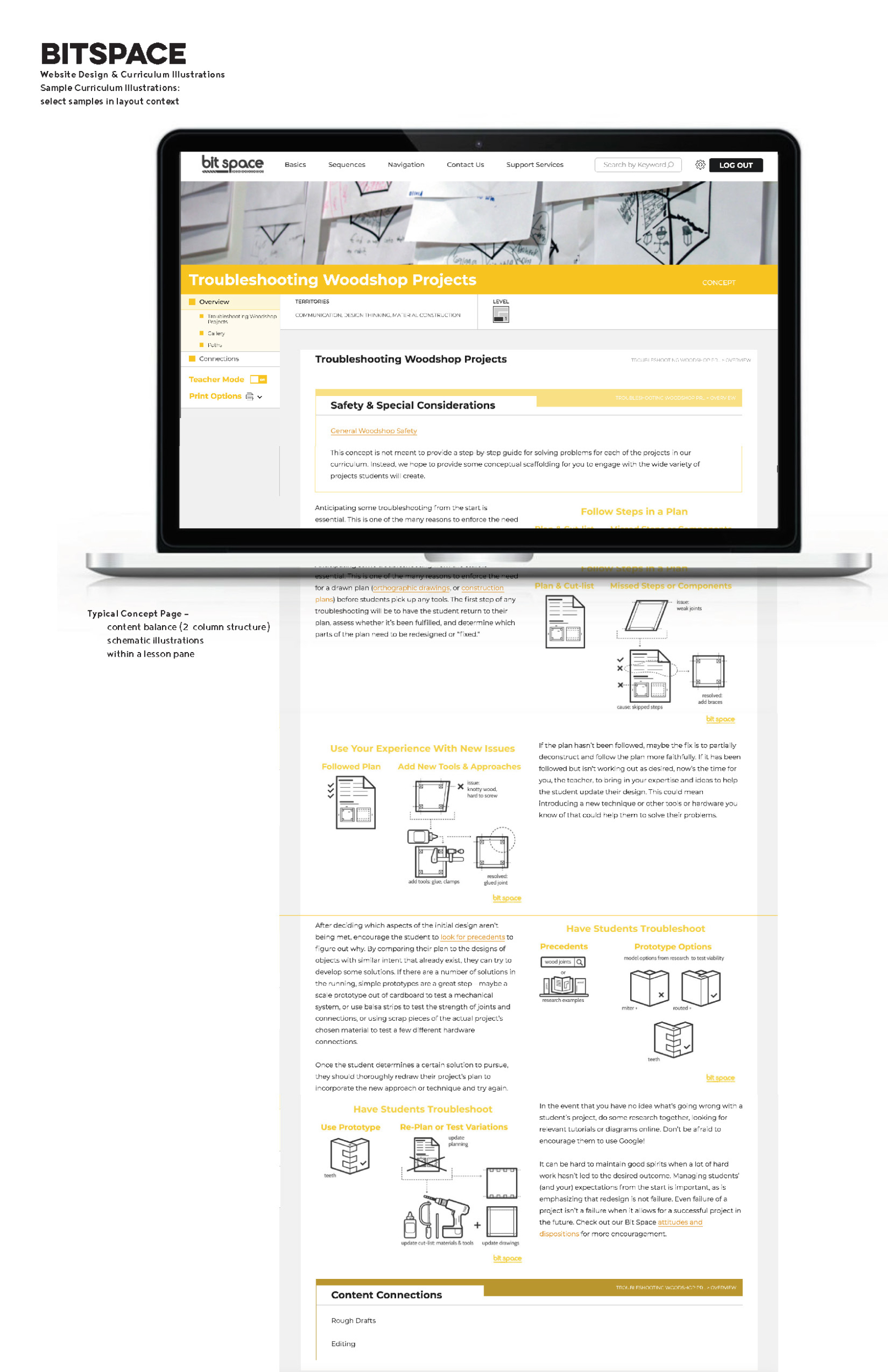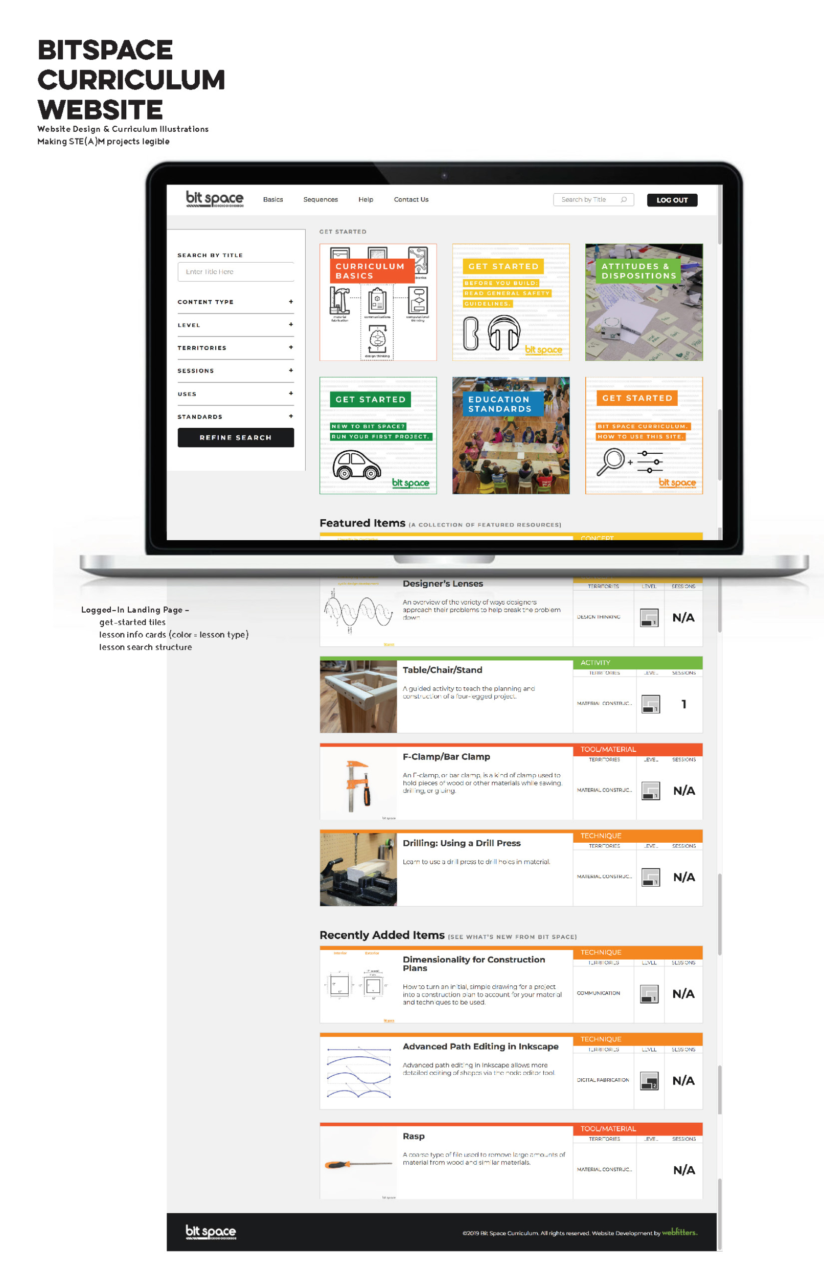 The BitSpace illustrations and interface design a) give graphic form to abstract concepts and b) help structure how lessons unfold for k-12 maker-space students, from simple tool introductions to elaborate, semester-length assignments.