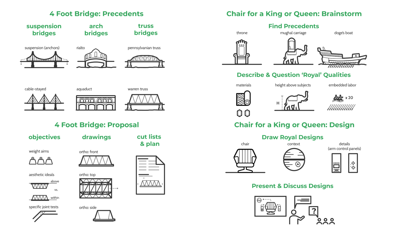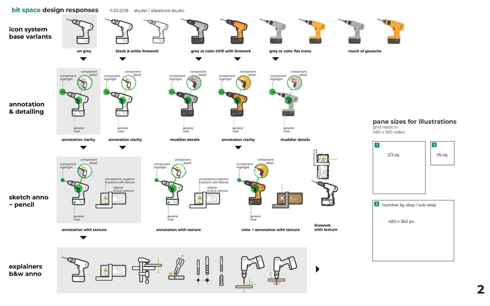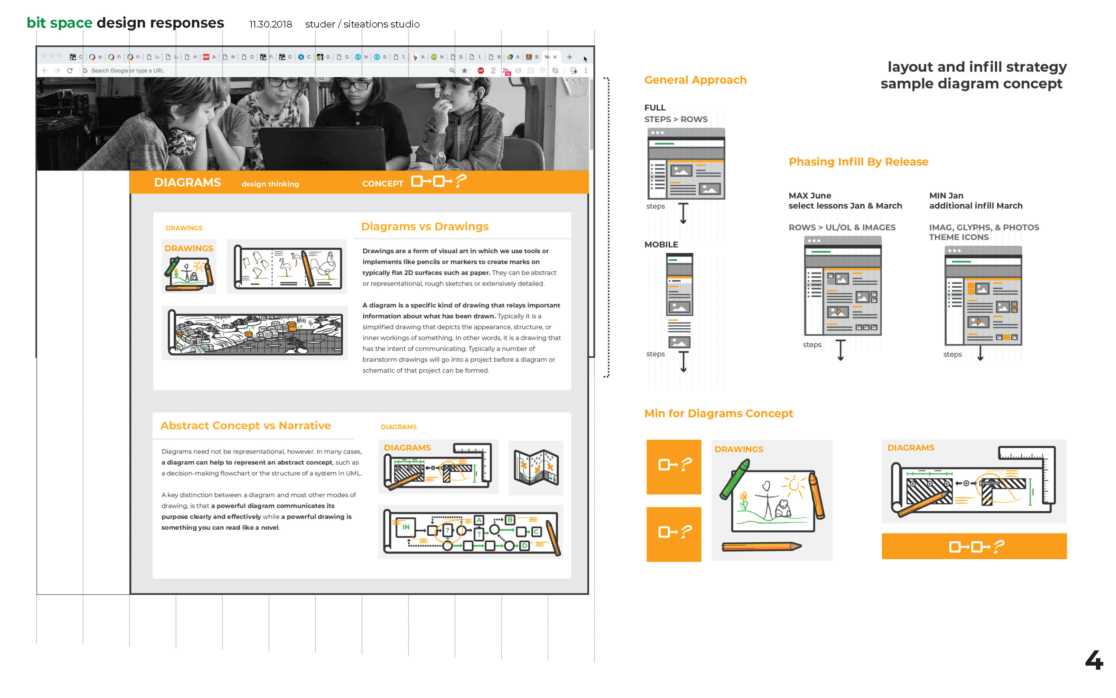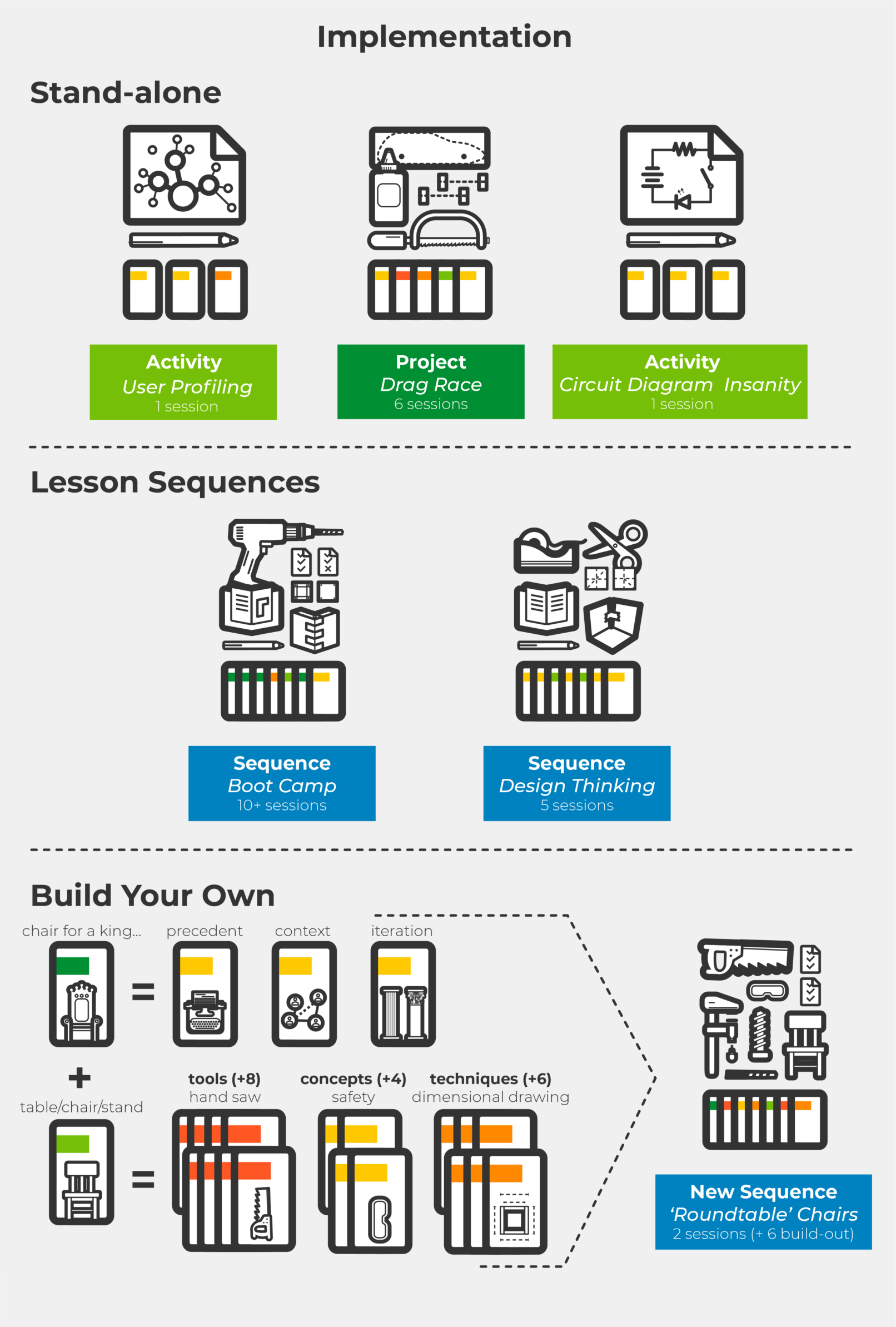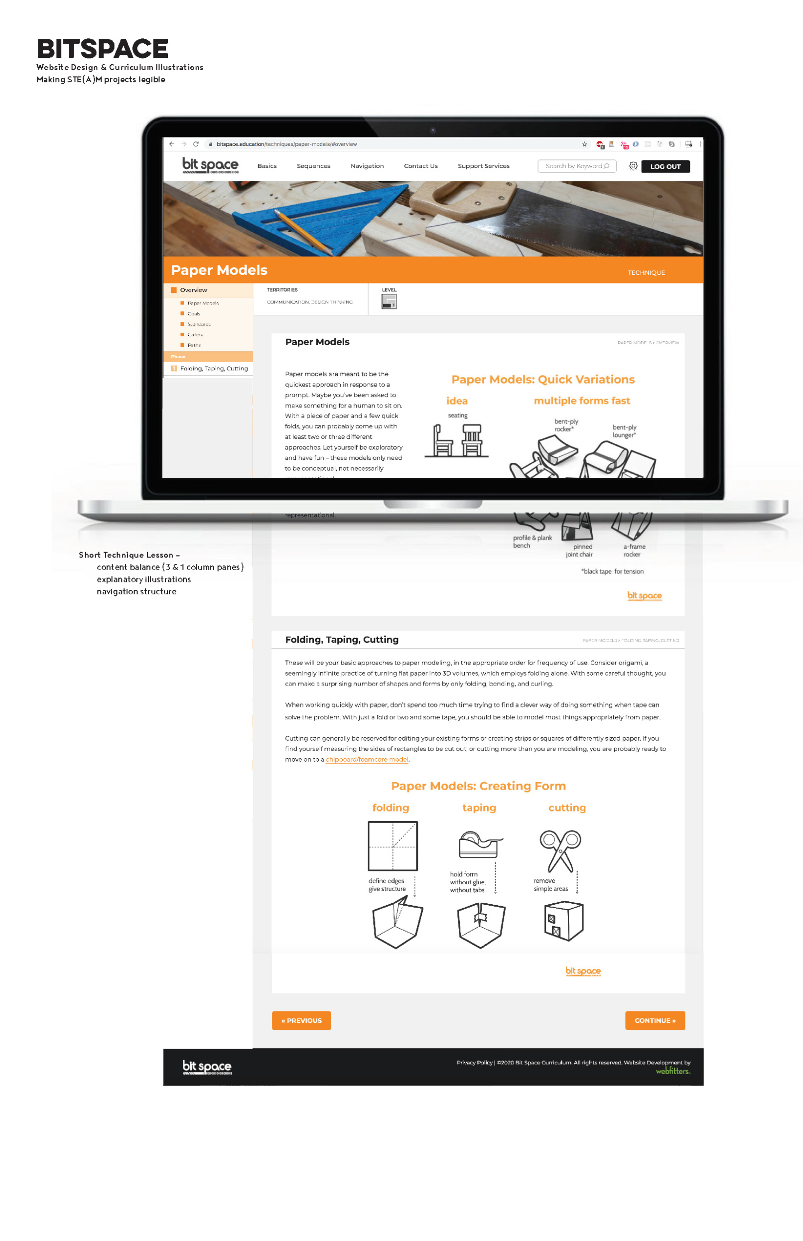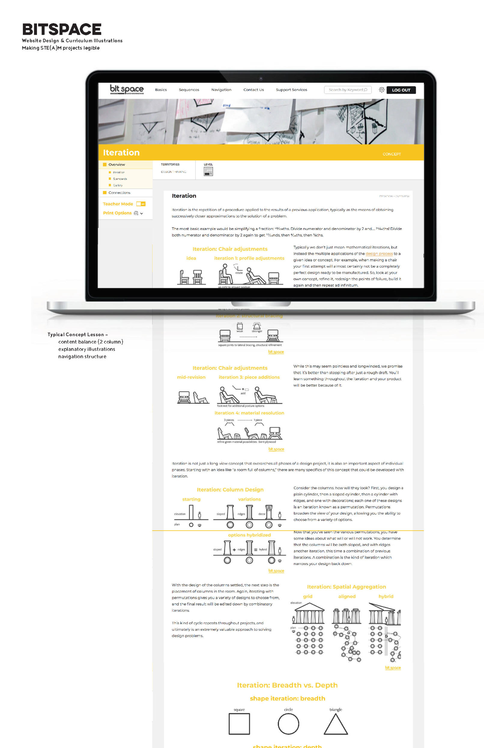 The BitSpace illustrations and interface design a) give graphic form to abstract concepts and b) help structure how lessons unfold for k-12 maker-space students, from simple tool introductions to elaborate, semester-length assignments.