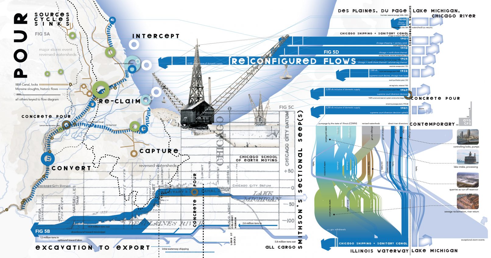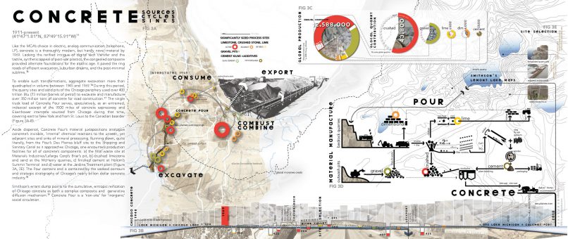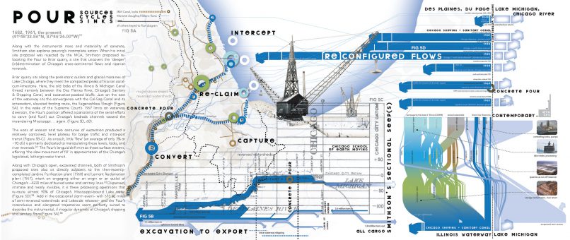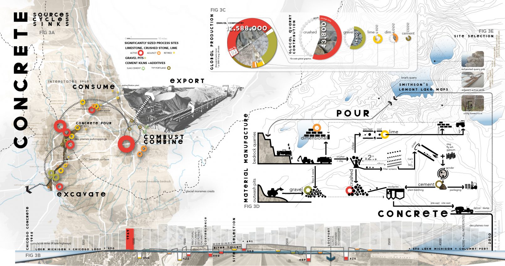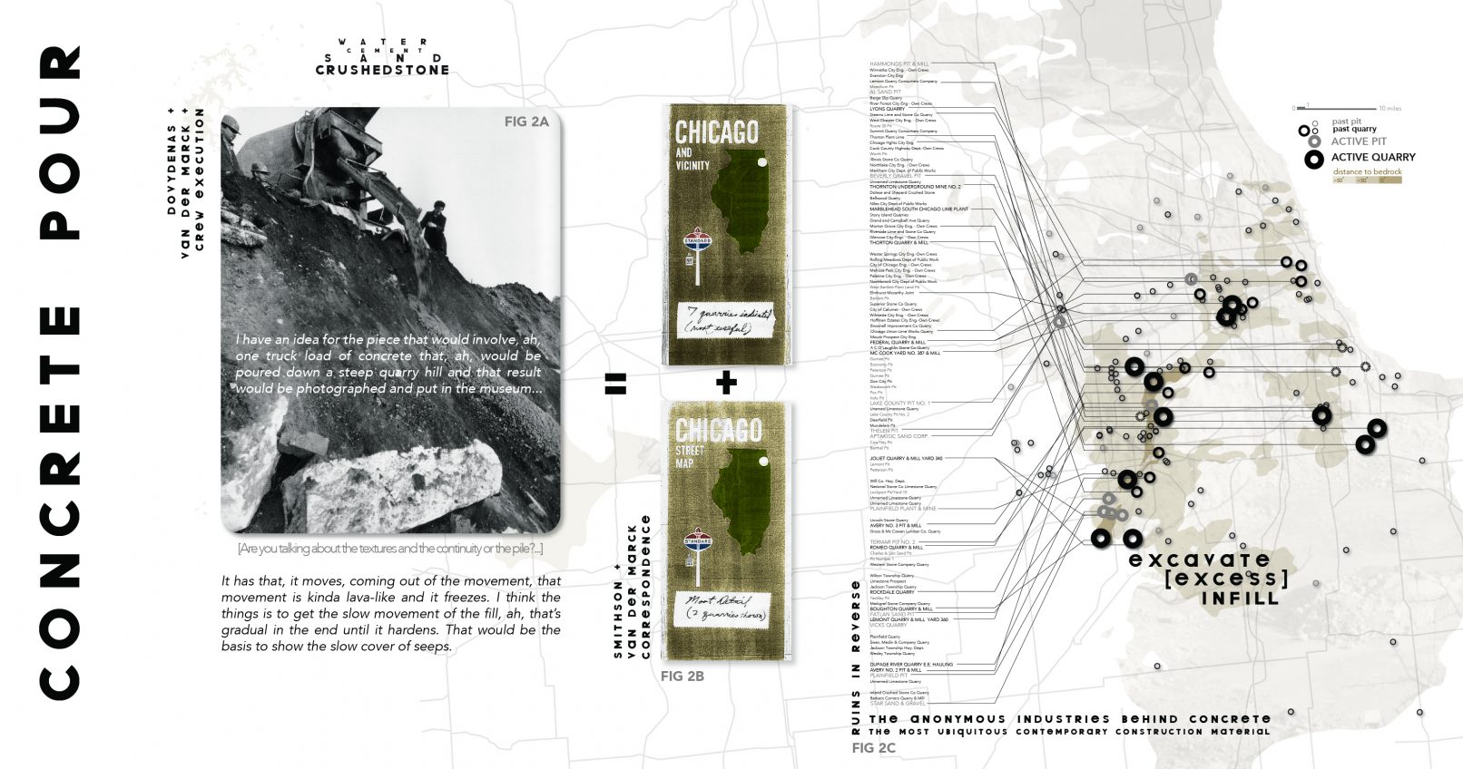 An early attempt to weave together my training in art history, landscape, and infographic explanation, this series unpacks the material metabolisms and metaphors at work in Robert Smithson’s Concrete Pour, done for Chicago’s Museum of Contemporary Art (MCA) in 1969.