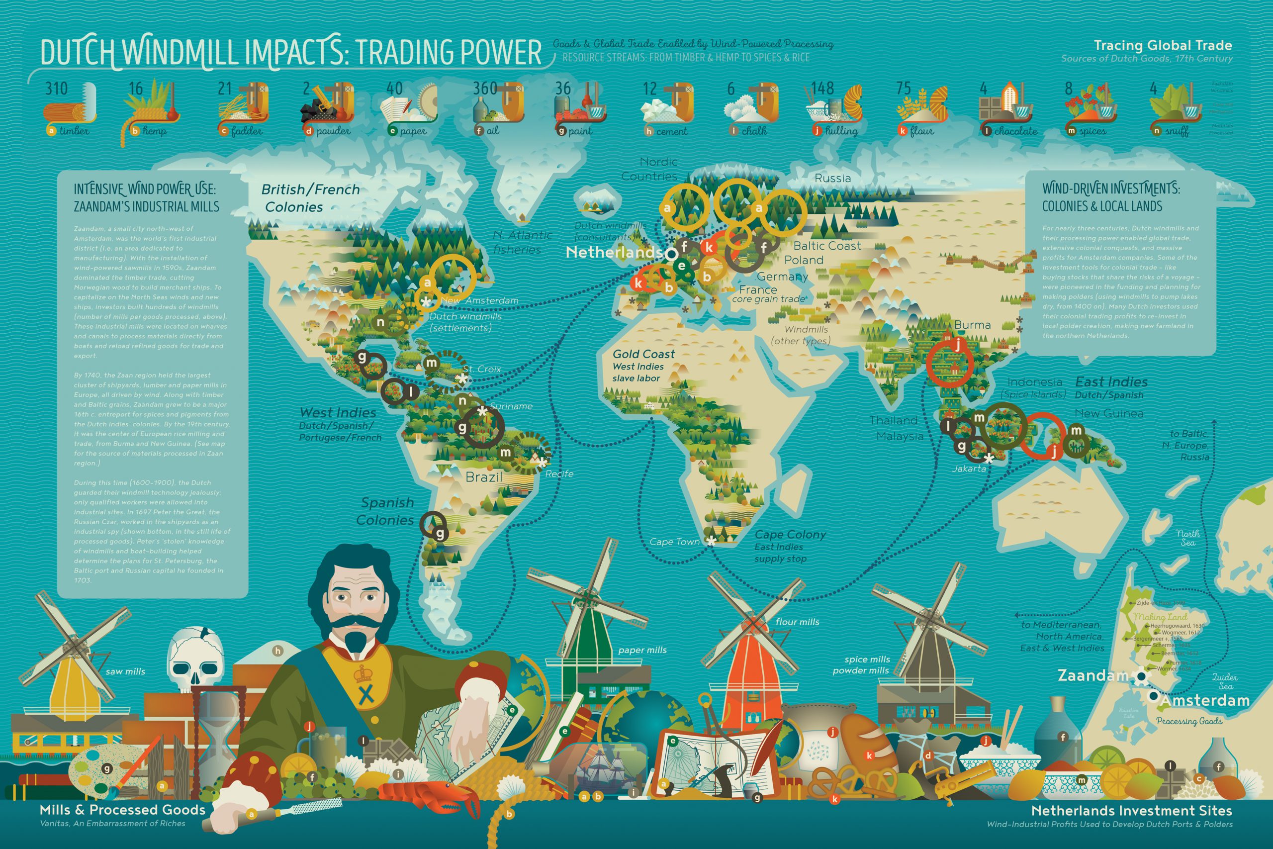 This pictorial map reaches from the Netherlands to the wider world around 1700, showing the origin of raw resources – spices, timber, grains, and pigments – processed in Zaandam’s windmills and traded by Amsterdam merchants, during the Dutch golden-age. Icons and a still-life (bottom) capture the intensity of windmill developments and the variety goods produced using wind.