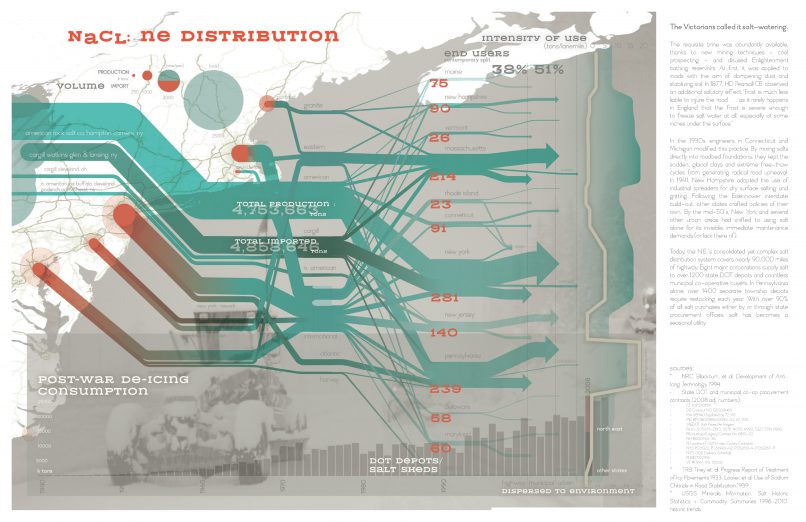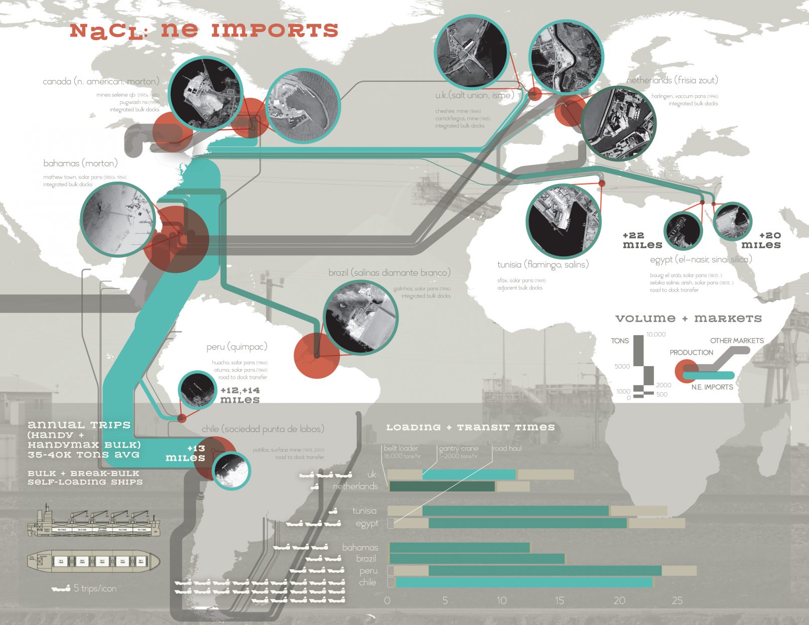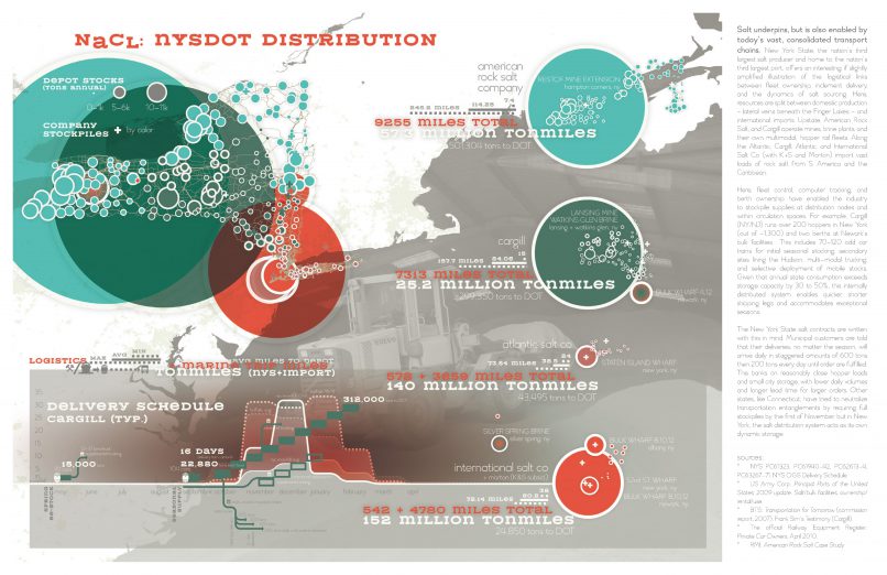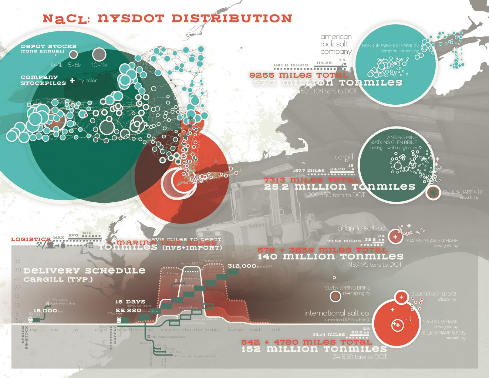 These original research mappings trace out the industrial ecologies of roadway melt; the systems that transform our highways, bi-ways, and city streets from seasonably passable, climatically contingent networks to eminently open, logistical lines.