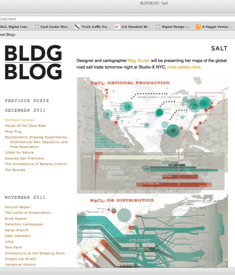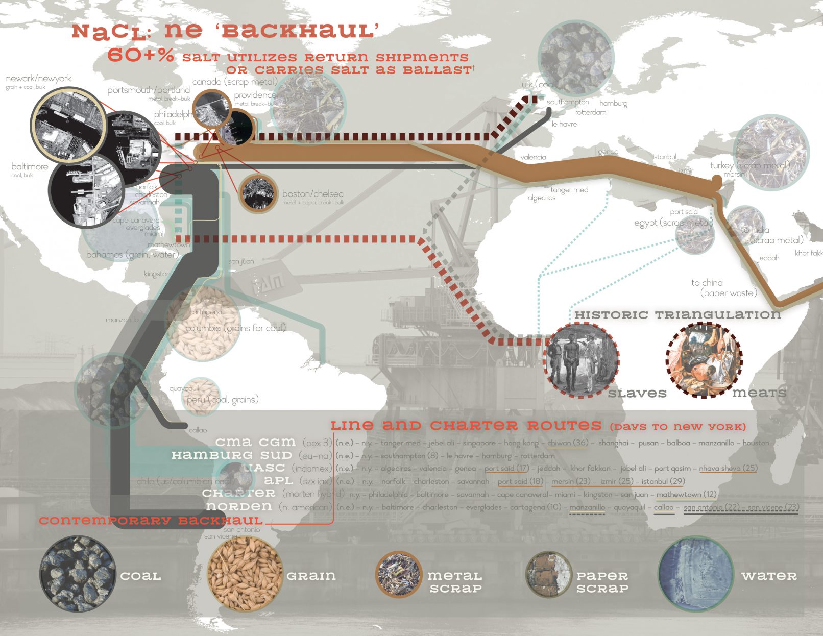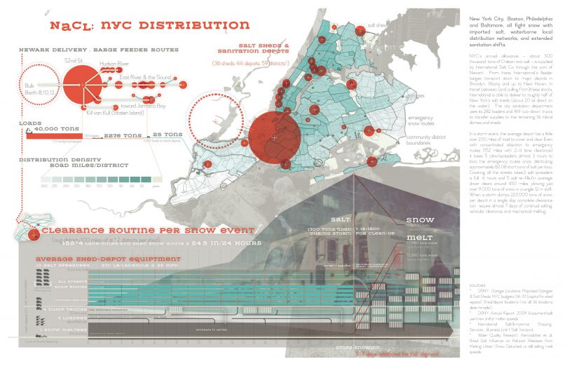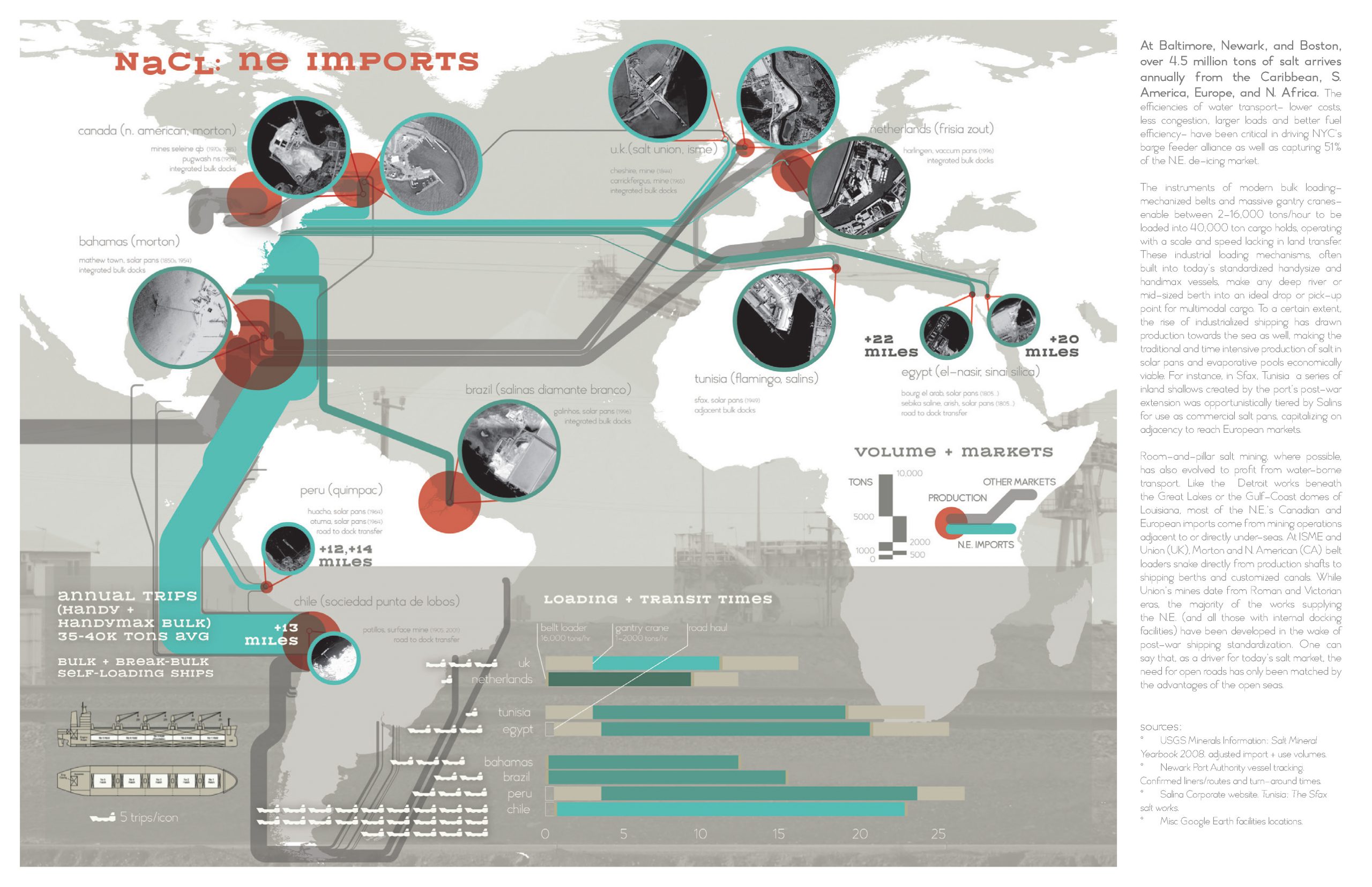 These original research mappings trace out the industrial ecologies of roadway melt; the systems that transform our highways, bi-ways, and city streets from seasonably passable, climatically contingent networks to eminently open, logistical lines.