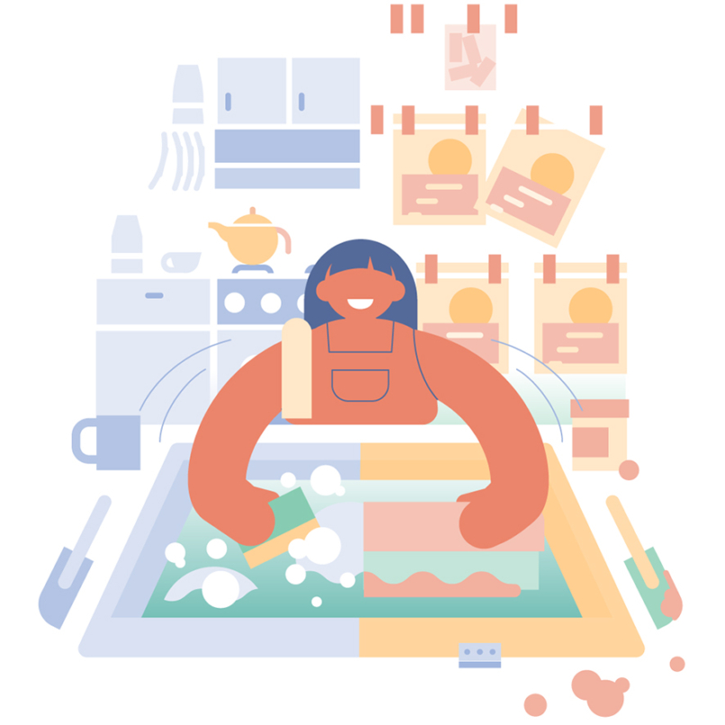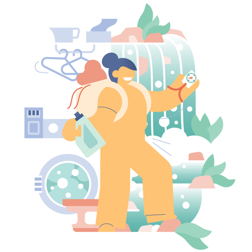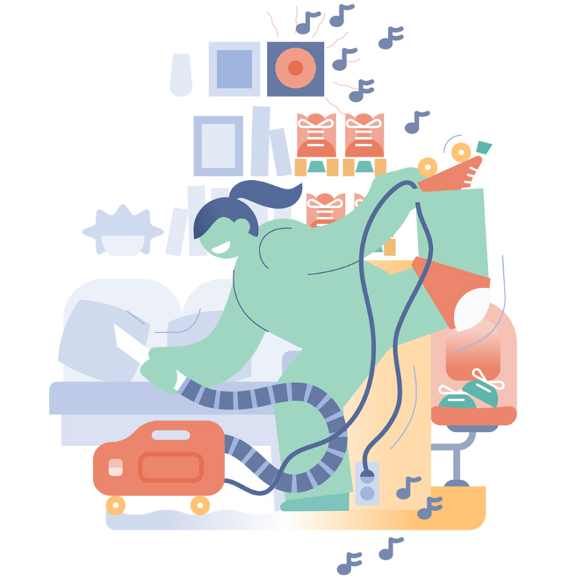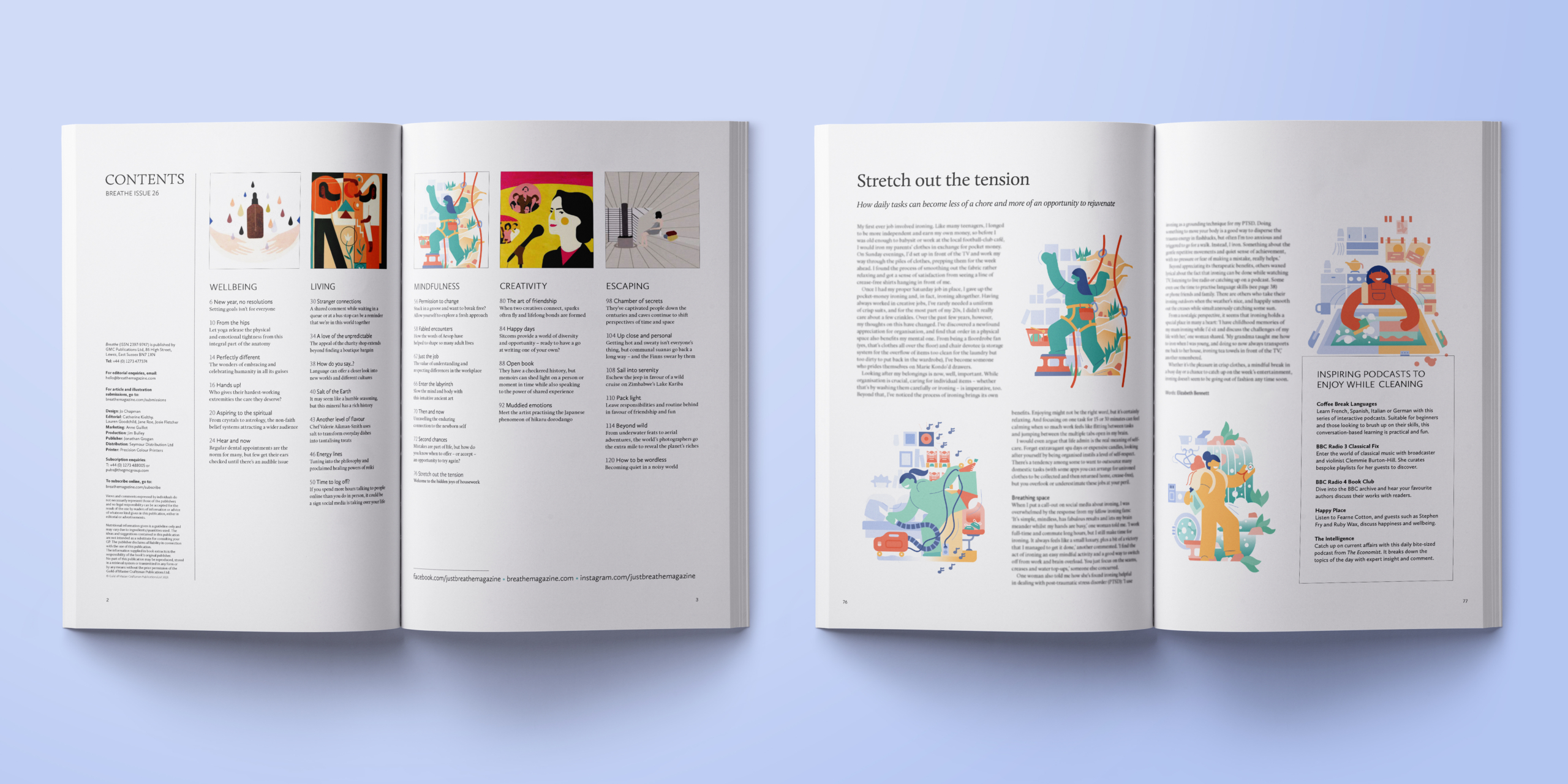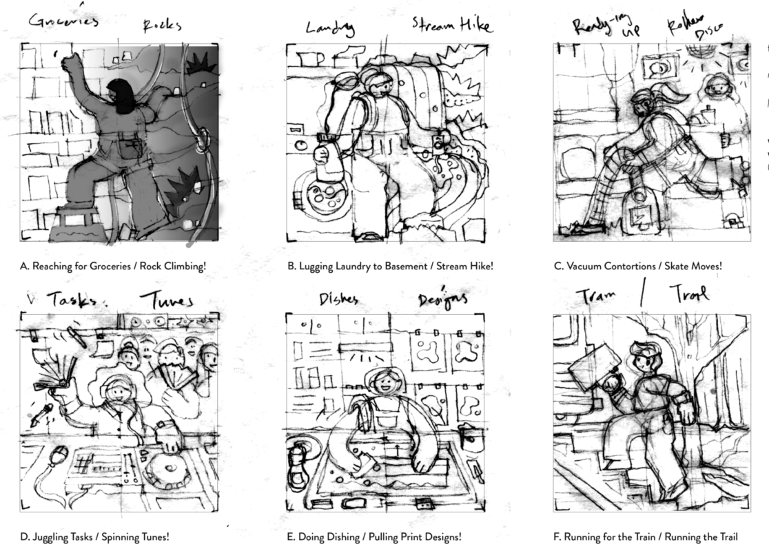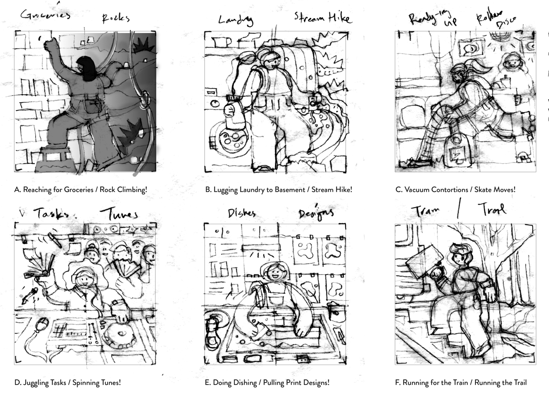 For this hypothetical wellness article, “Everyday Joy in Motion,” I decided to focus on ‘joy in motion’ and picture the potential of muscle memory and familiar postures to transport us from boring (or even annoying) tasks to imagined, energizing recreation.