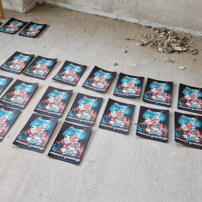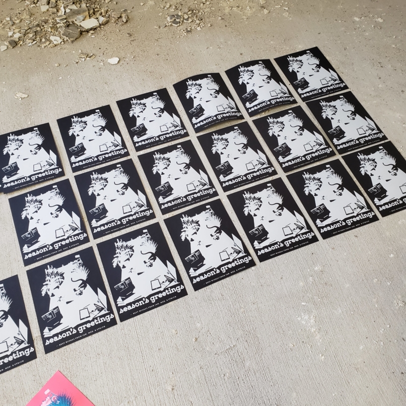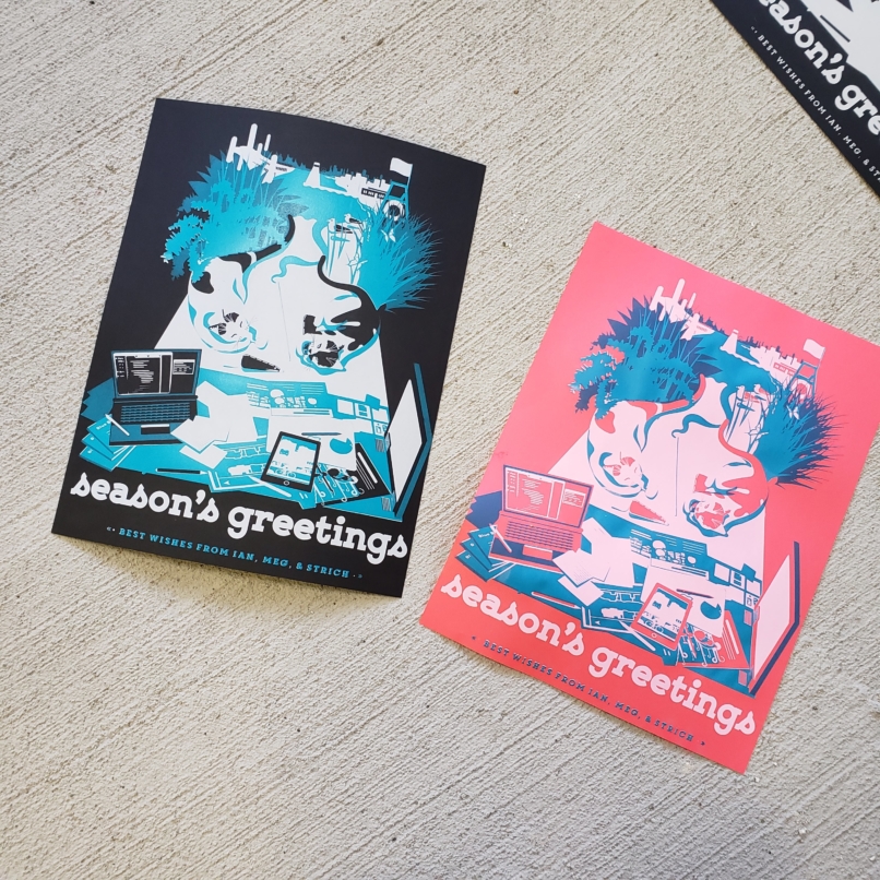 Screen print celebrates the Chicago shore, dunes, various cat, and career milestones of 2019. Ink layers – on black cardstock – include white (opaque), turquoise (25% thinned), red (25% thinned), and finished with white (50% thinned).