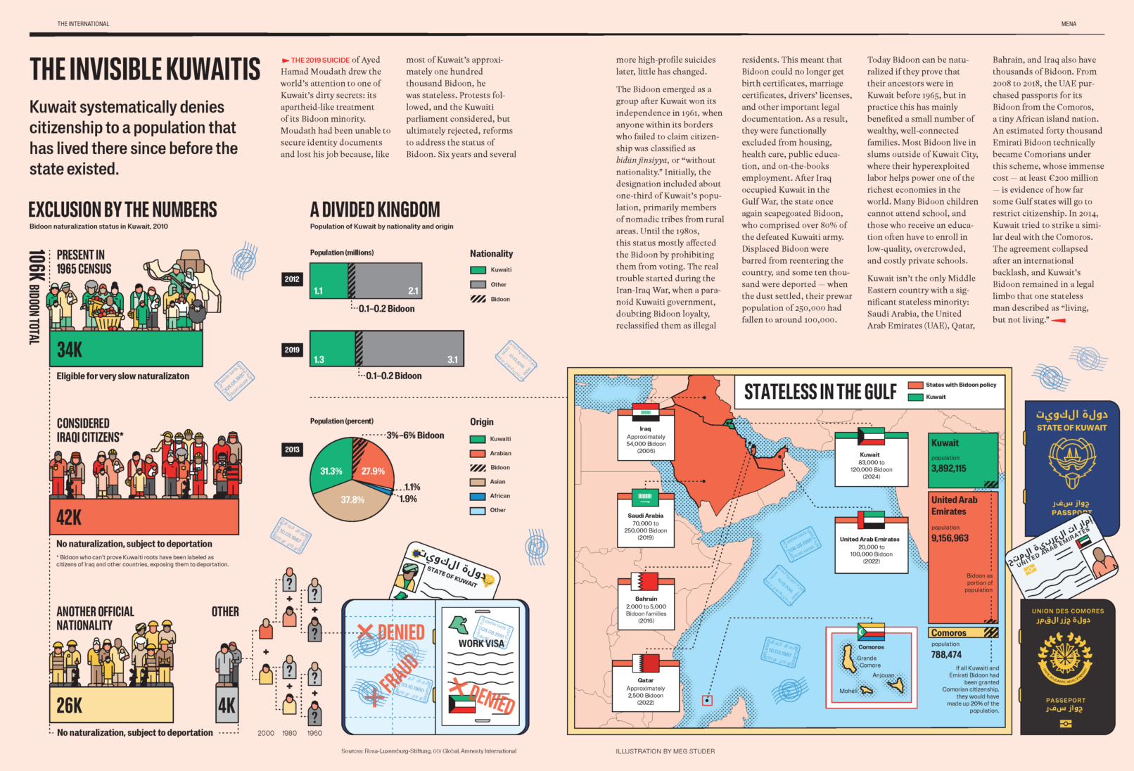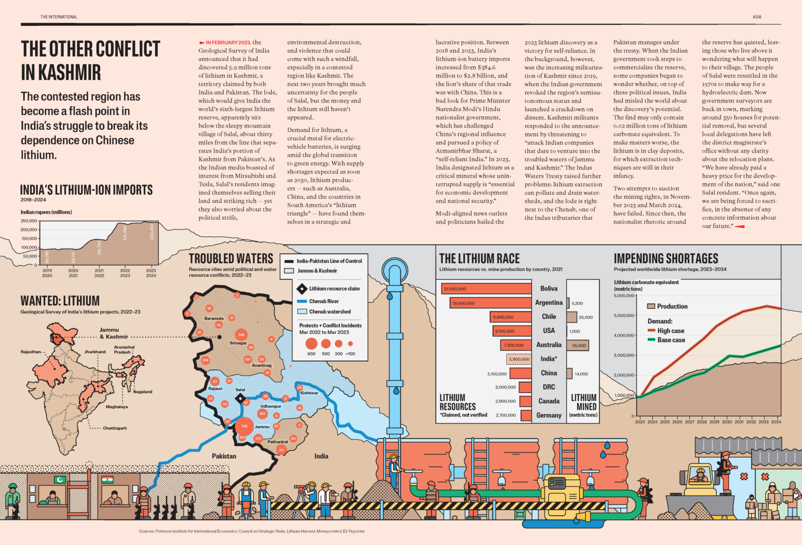 A series of two infographic spreads for Jacobin’s ‘Internationalist’ section, on politics/policy around the world. Infographics covered a) the ‘state-less’ indigenous Bidoon, who have been denied citizenship in Kuwait, largely in the wake of the Iraqi War and b) the Indian government’s claim to have found lithium in the contested territories of Kashmir (and the impact of resource struggles/development more generally).