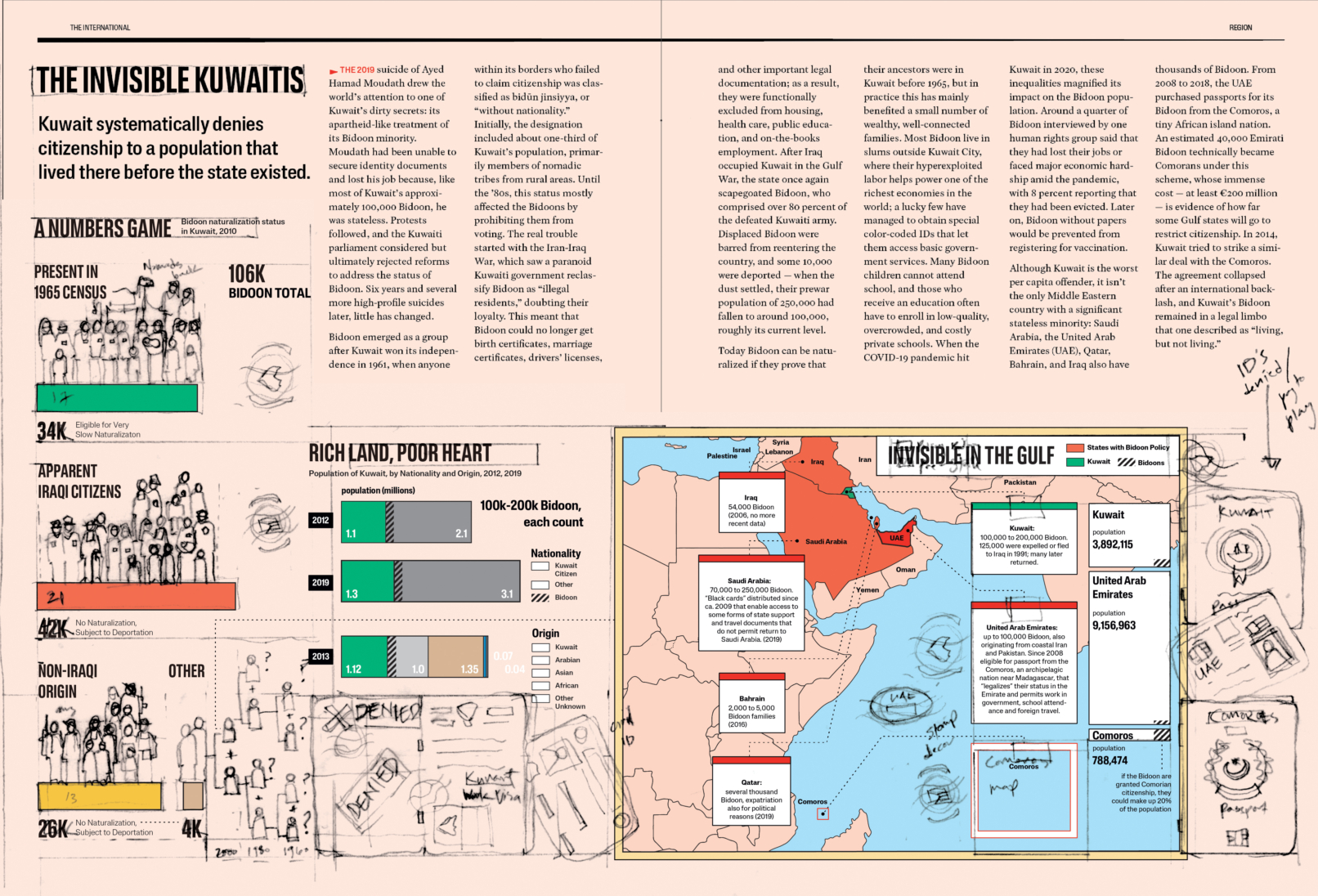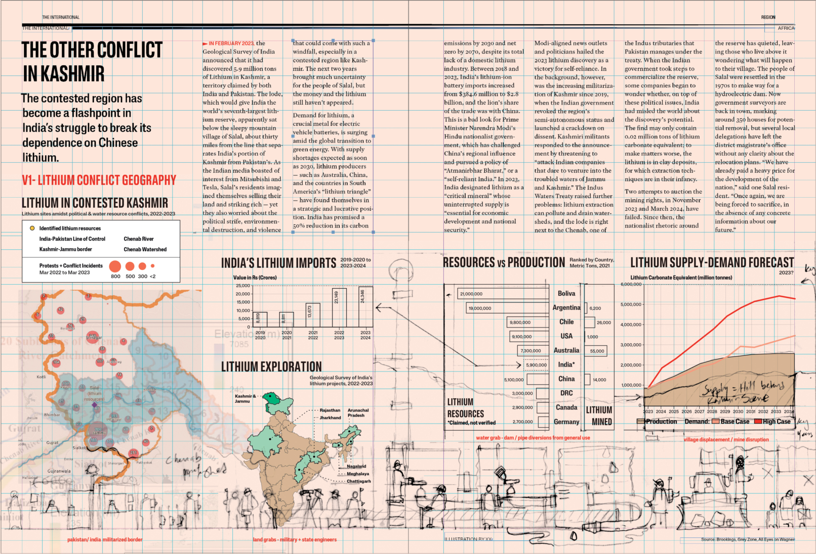 A series of two infographic spreads for Jacobin’s ‘Internationalist’ section, on politics/policy around the world. Infographics covered a) the ‘state-less’ indigenous Bidoon, who have been denied citizenship in Kuwait, largely in the wake of the Iraqi War and b) the Indian government’s claim to have found lithium in the contested territories of Kashmir (and the impact of resource struggles/development more generally).