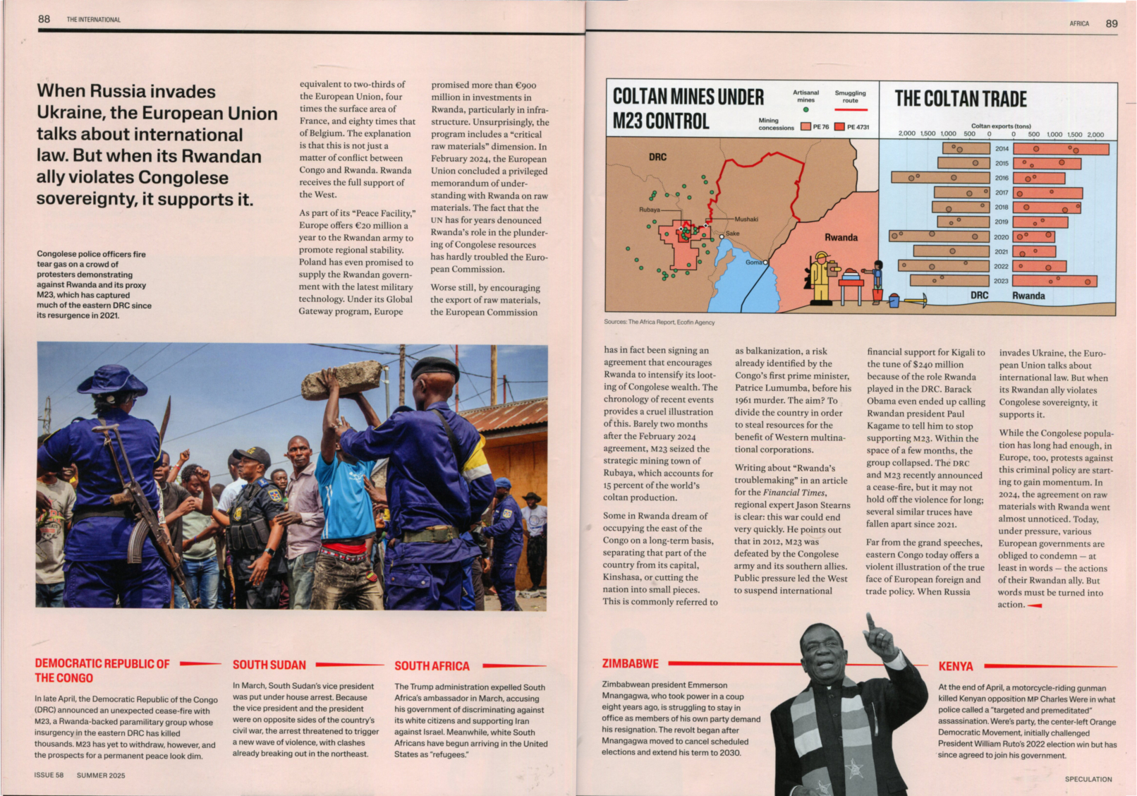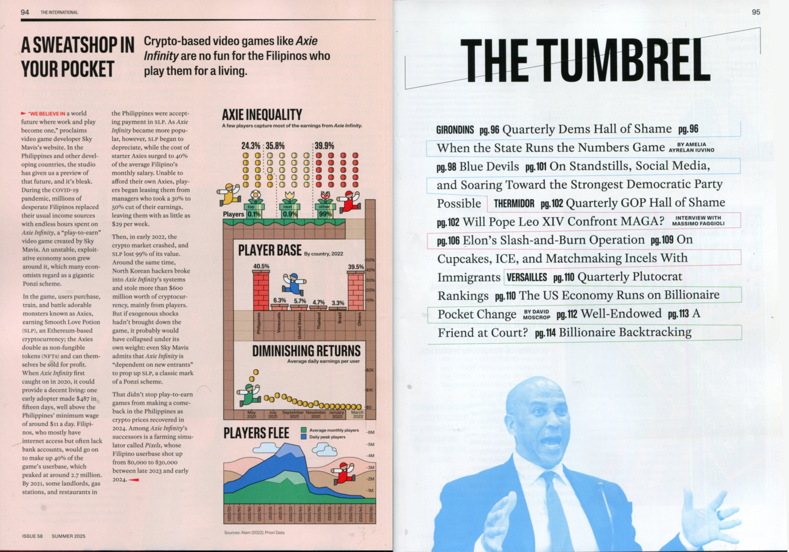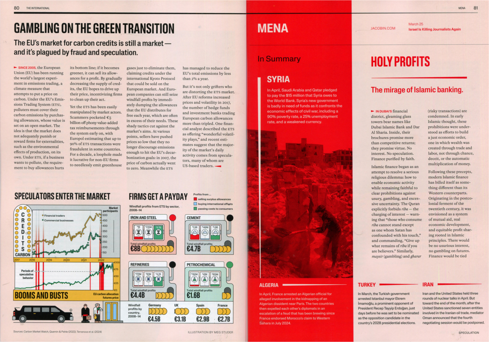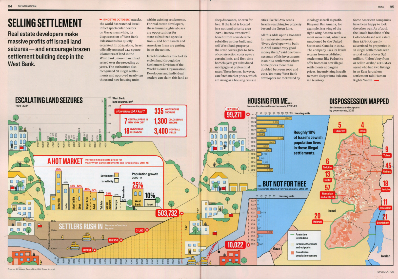 A series of four infographic layouts for Jacobin’s ‘Internationalist’ section, on politics/policy around the world. Infographics covered a) the European carbon credit system as a speculative tool, largely unlinked from incentivizing sustainable investment, b) Israeli settlement expansion and land theft, as accelerated during the conflict with Gaza, d) Uganda’s trade in T3 conflict minerals and its funding of genocide in the DRC, and c) the way video-game currencies, in the Philippines and elsewhere, enable exploitive, informal economies.