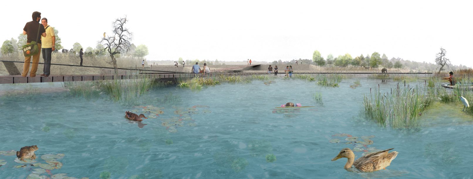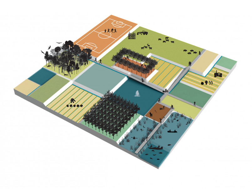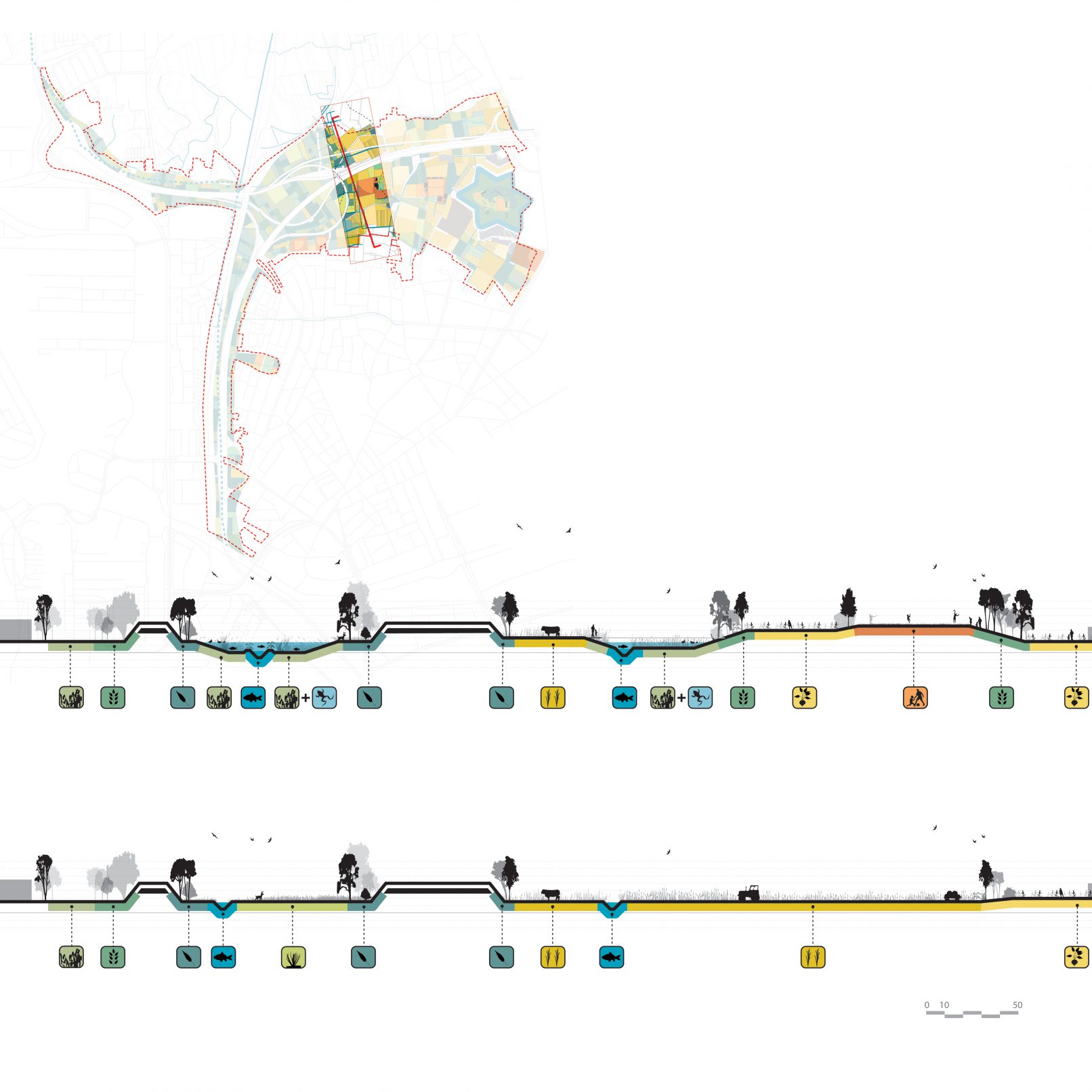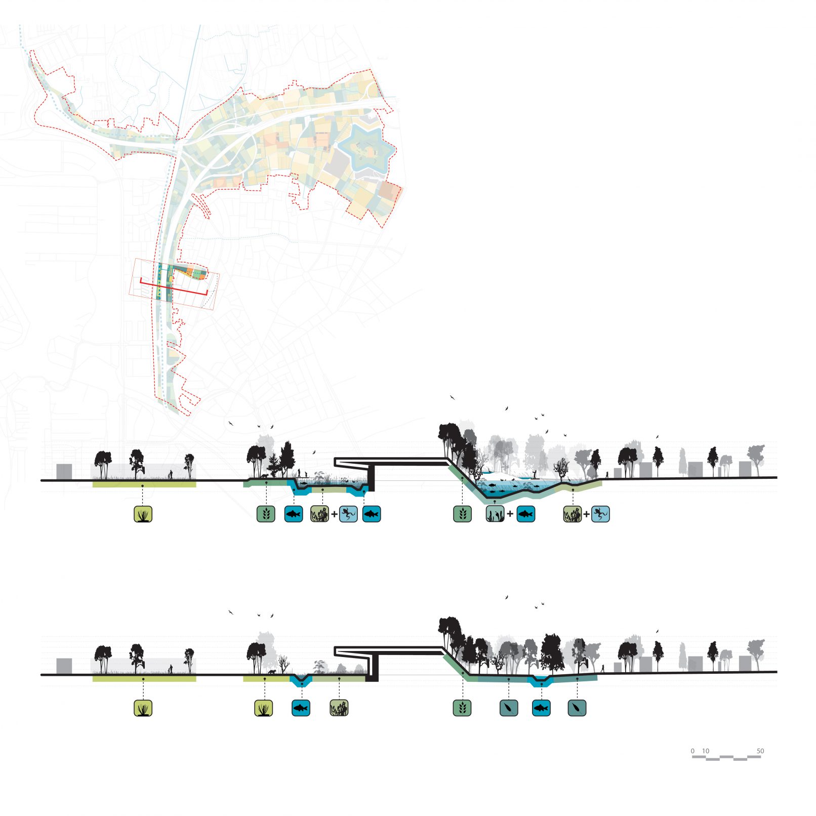 This proposal showcases elevation-based strategies for integrating planting and programmatic variation, in a new park at the edges of Antwerp. Sectional series form the core of the diagrams with ‘before/after’ views and 3D models interwoven aside traditional renderings.