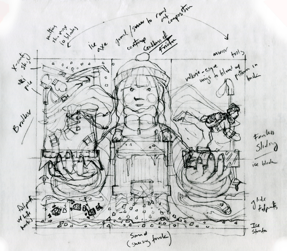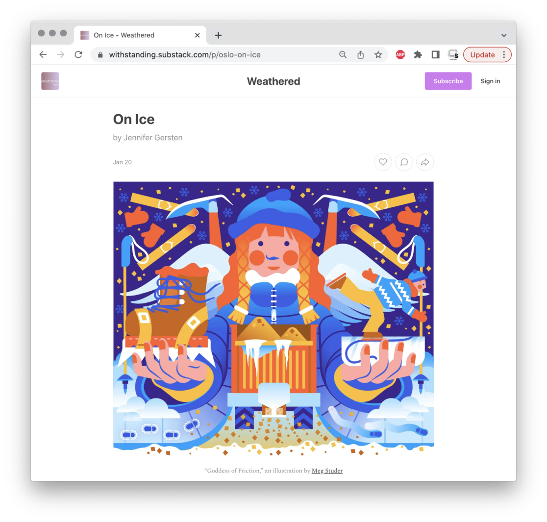 Early in her essay ‘On Ice,’ Jennifer Gersten laments that there is no Norwegian deity of friction, to help her traverse the icy streets of Oslo. This illustration thus imagines a Goddess of Friction, offering forth tools of traction: gravel, cleats, and a ‘freestyle’ embrace of deliberate sliding.