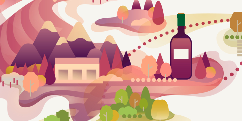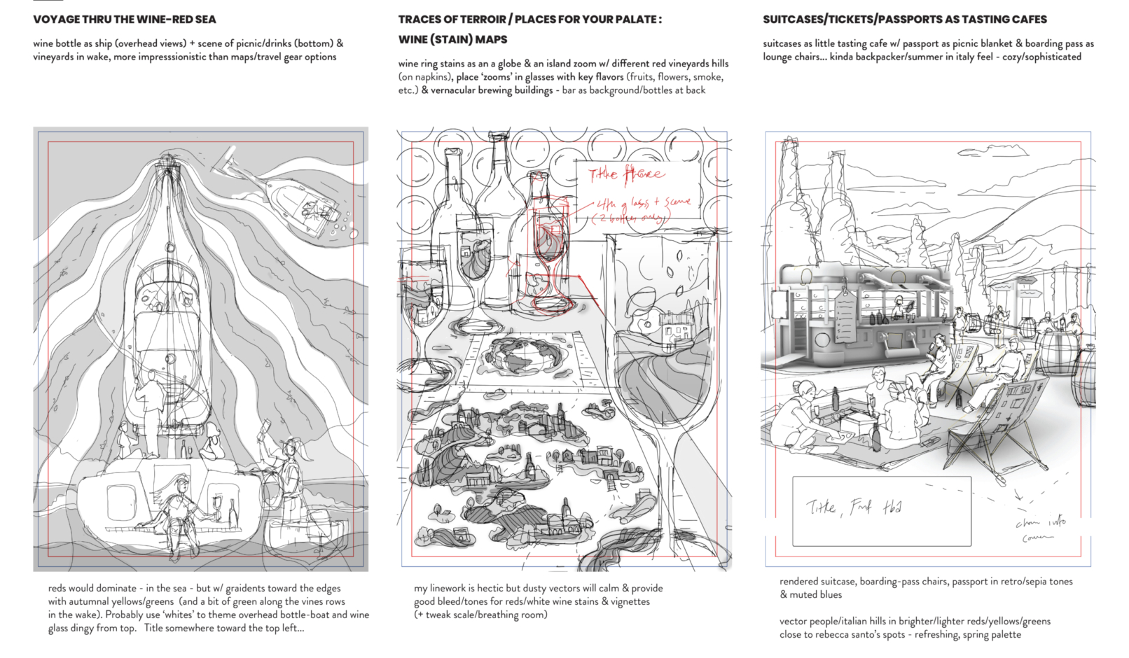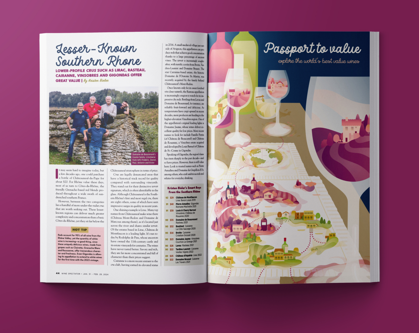 Based on the Wine Spectator’s annual recommendations list, “Passport to value,” I decided to incorporate their idea of a travel map. Wine-stained napkins form the basis for the globe and an archipelago of vineyards, with glasses of wine echoing hints of terroir in the same scenic language.