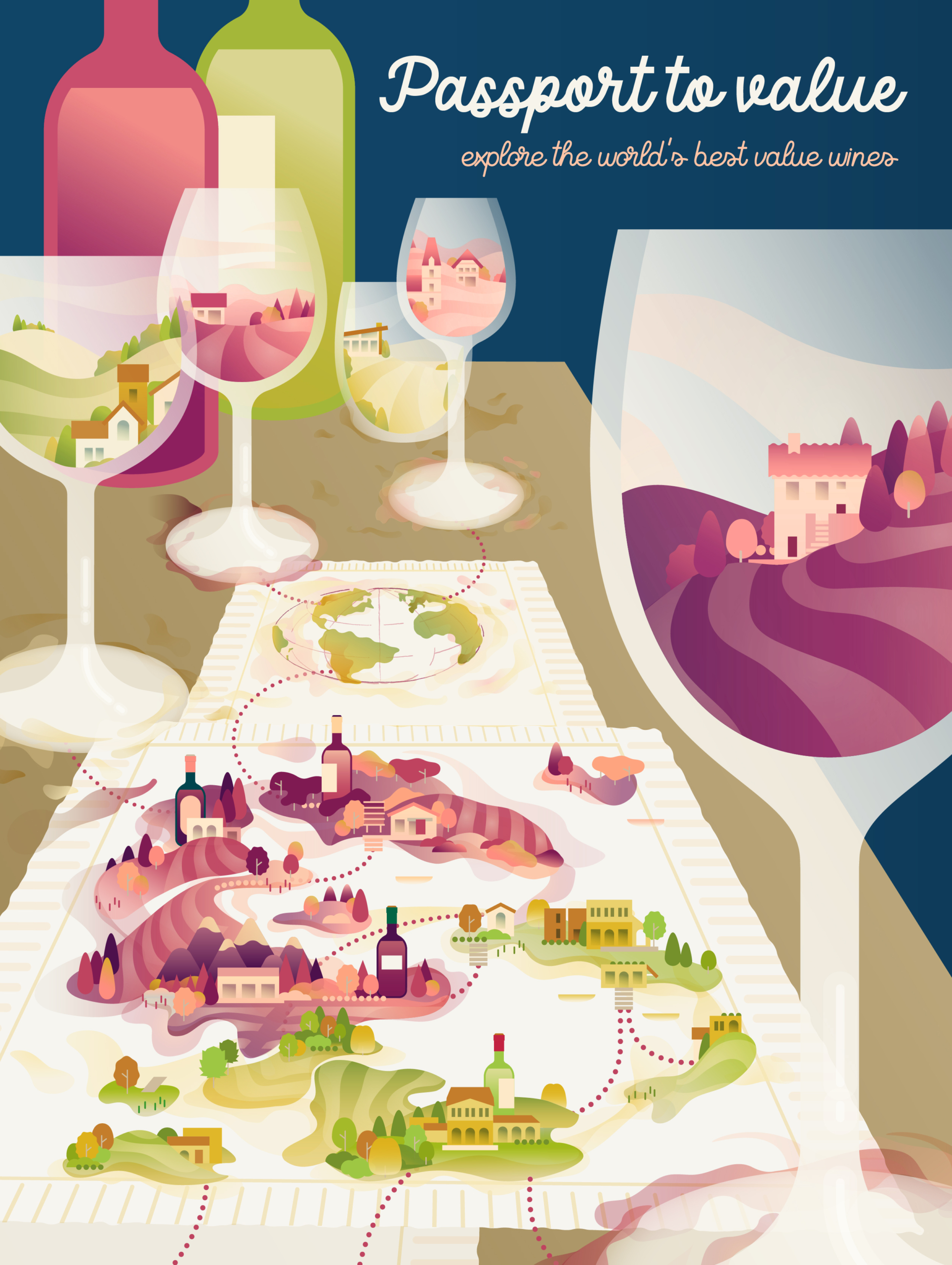 Based on the Wine Spectator’s annual recommendations list, “Passport to value,” I decided to incorporate their idea of a travel map. Wine-stained napkins form the basis for the globe and an archipelago of vineyards, with glasses of wine echoing hints of terroir in the same scenic language.