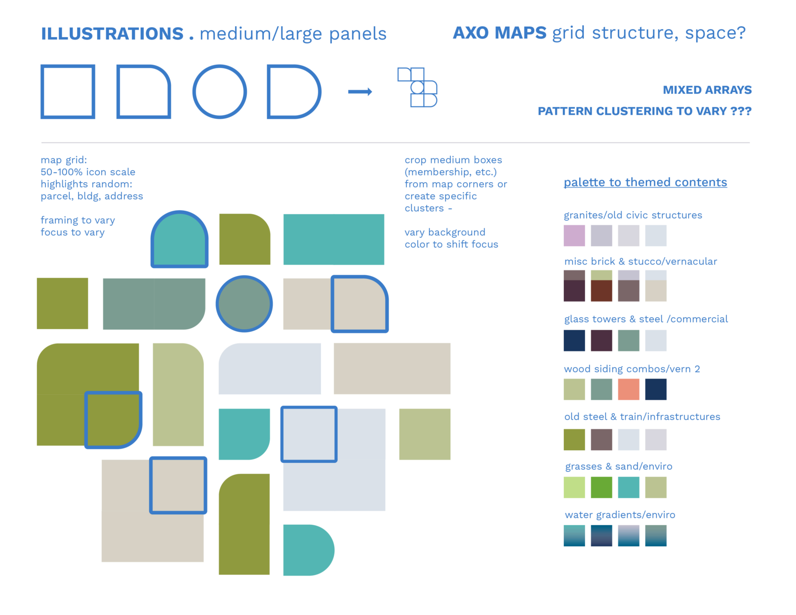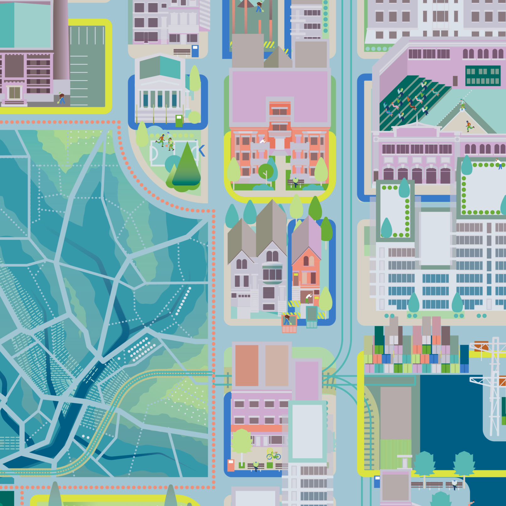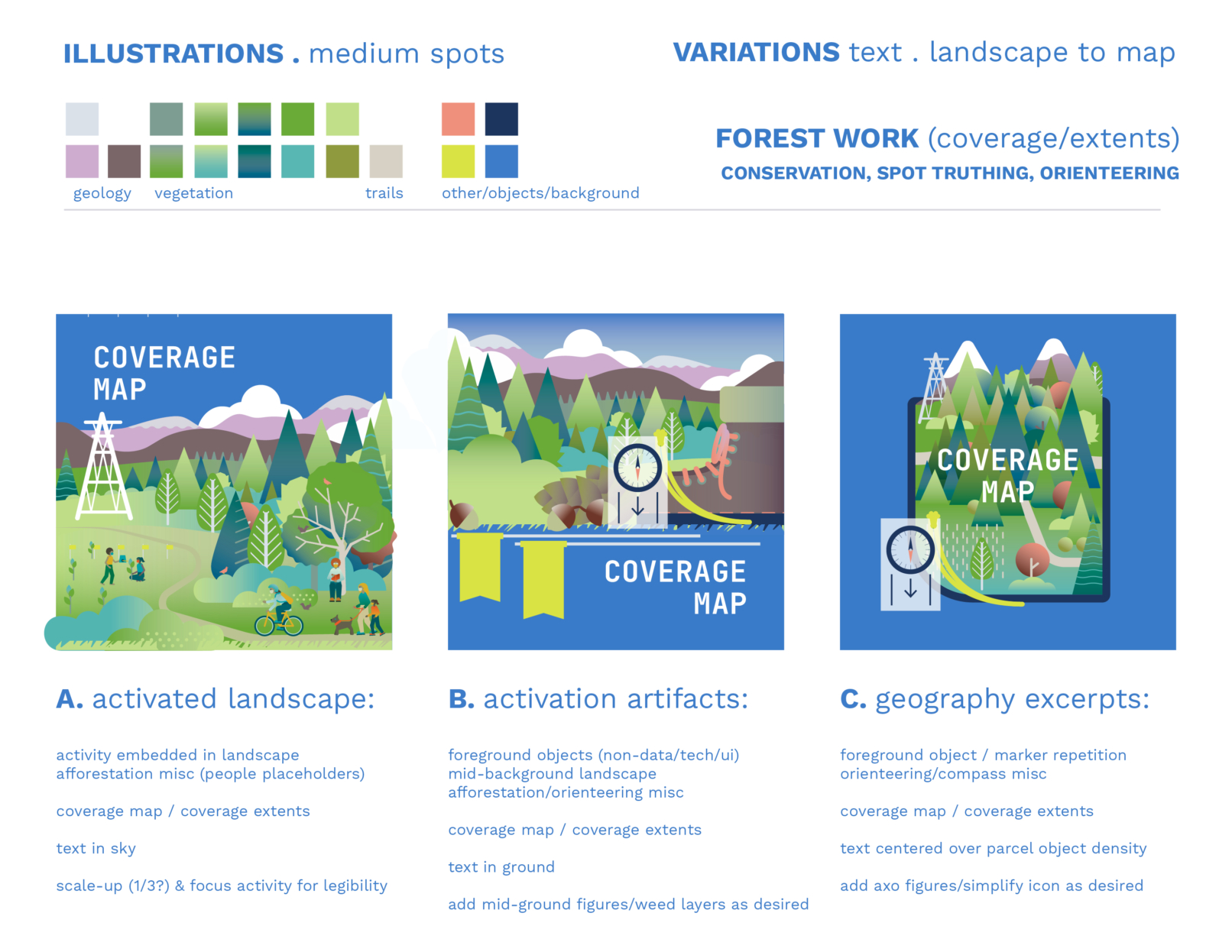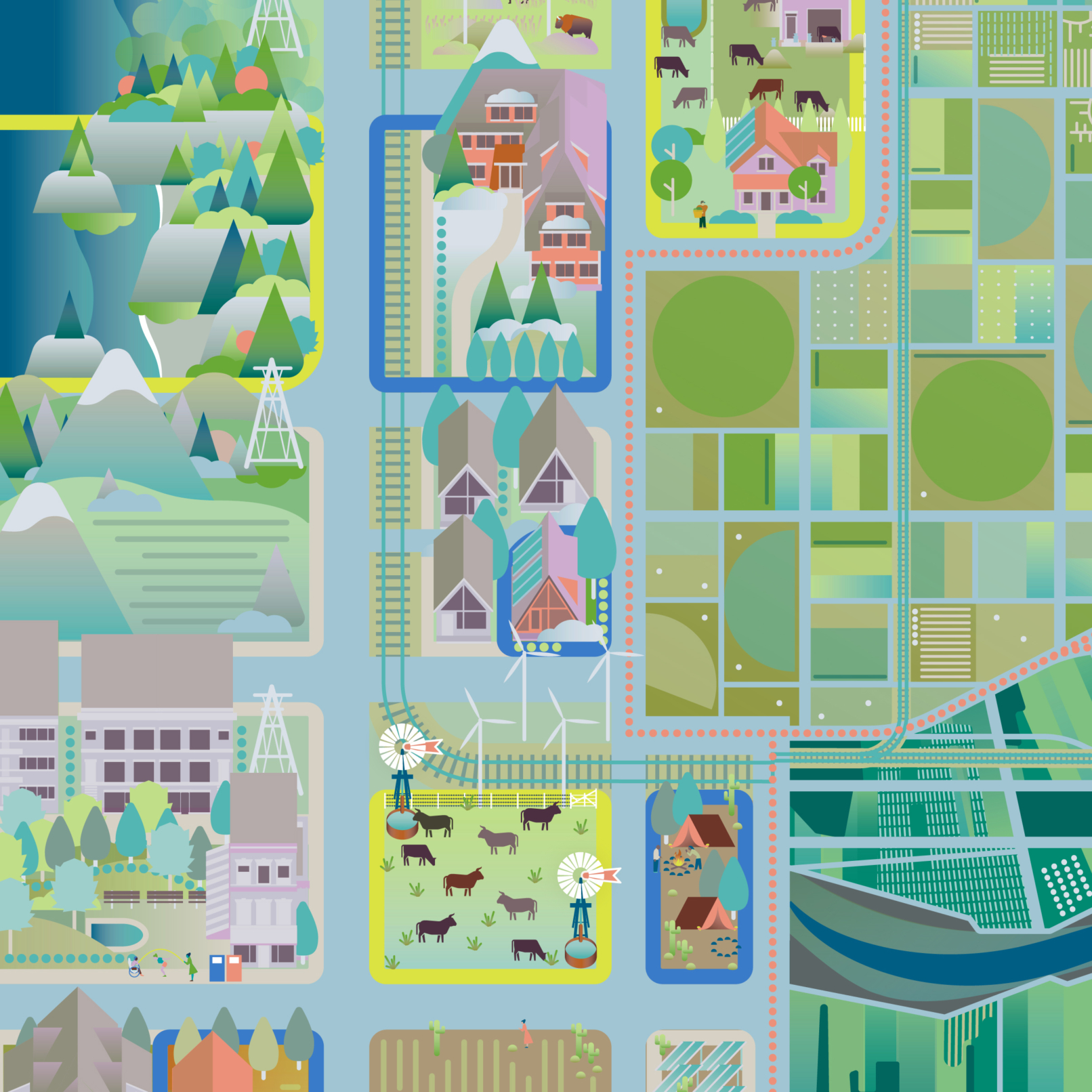 Regrid provides a nationwide dataset of land parcel boundaries and building footprints. These illustrations were commissioned for their website relaunch in July 2021; featuring parcel data extents (maps patterns) and uses (scenes of orienteering, construction, planning, etc.).