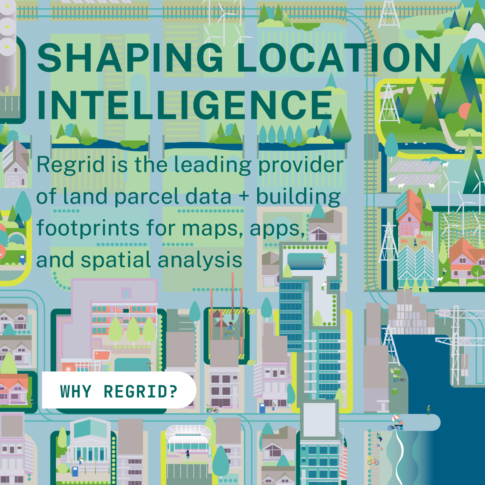 Regrid provides a nationwide dataset of land parcel boundaries and building footprints. These illustrations were commissioned for their website relaunch in July 2021; featuring parcel data extents (maps patterns) and uses (scenes of orienteering, construction, planning, etc.).