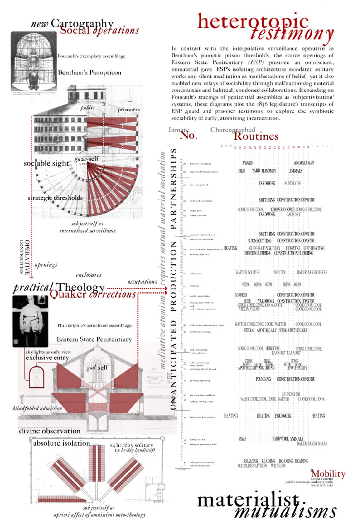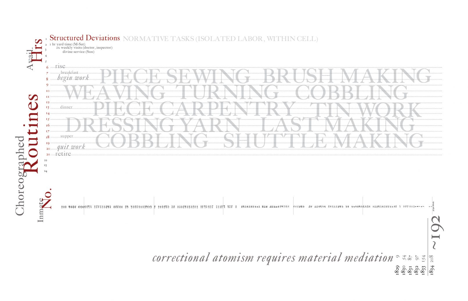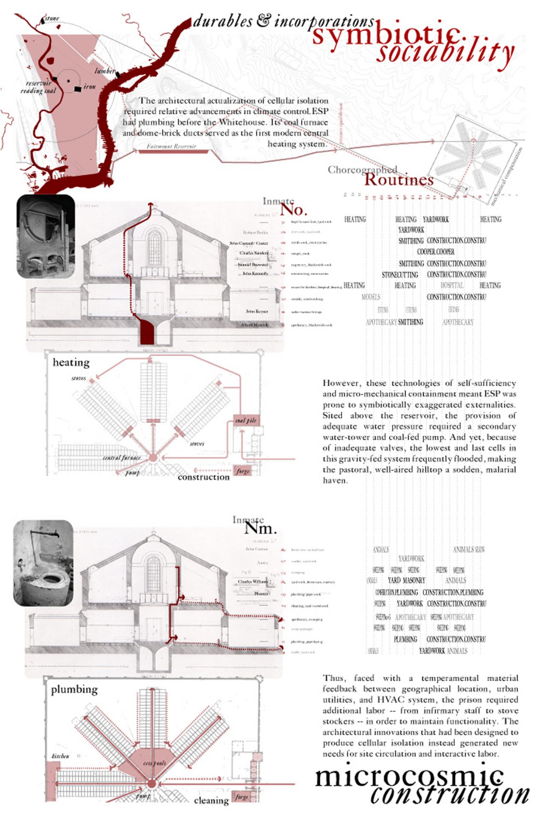 Eastern State Penitentiary’s isolating architecture mandated solitary works and silent meditation as a manifestations of belief, yet it also enabled new relays of contact though malfunctioning building systems and habitual, condoned collaboration. This series plot the 1836 legislature’s testimony transcripts of ESP’s guards and prisoners, to explore the symbiotic sociability of early, atomizing incarceration.