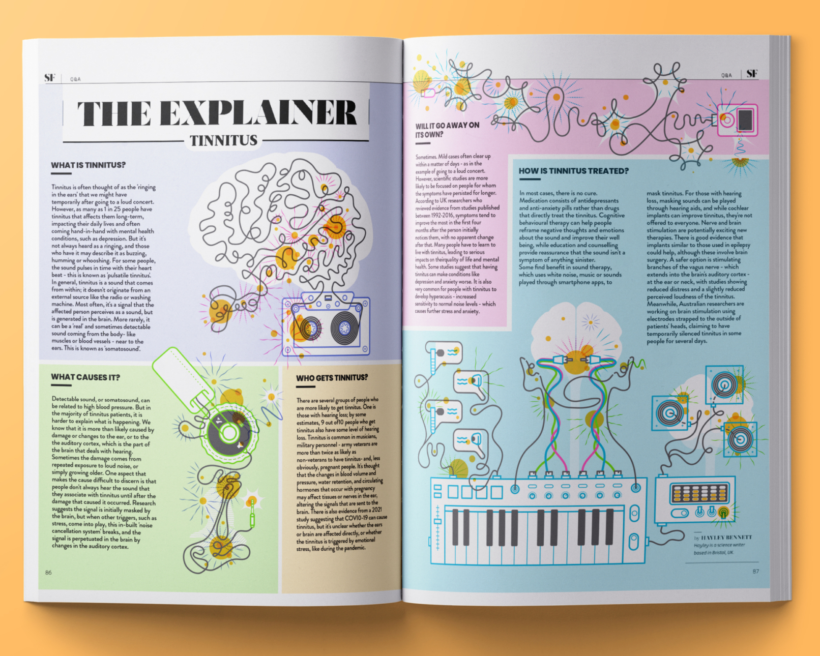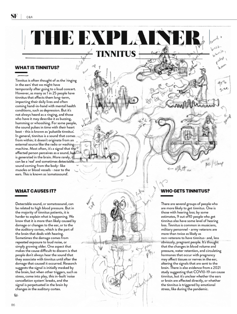 To practice making simpler, punchier editorial concepts, I developed these illustrations of audio glitches (misfirings/miswirings) as analogies for the symptoms and causes for tinnitus. The text & dual layouts (as inspiration) are from an existing BBC Science Focus ‘The Explainer’ column. (Original print article ran Oct 24, 2022; web text available here.)