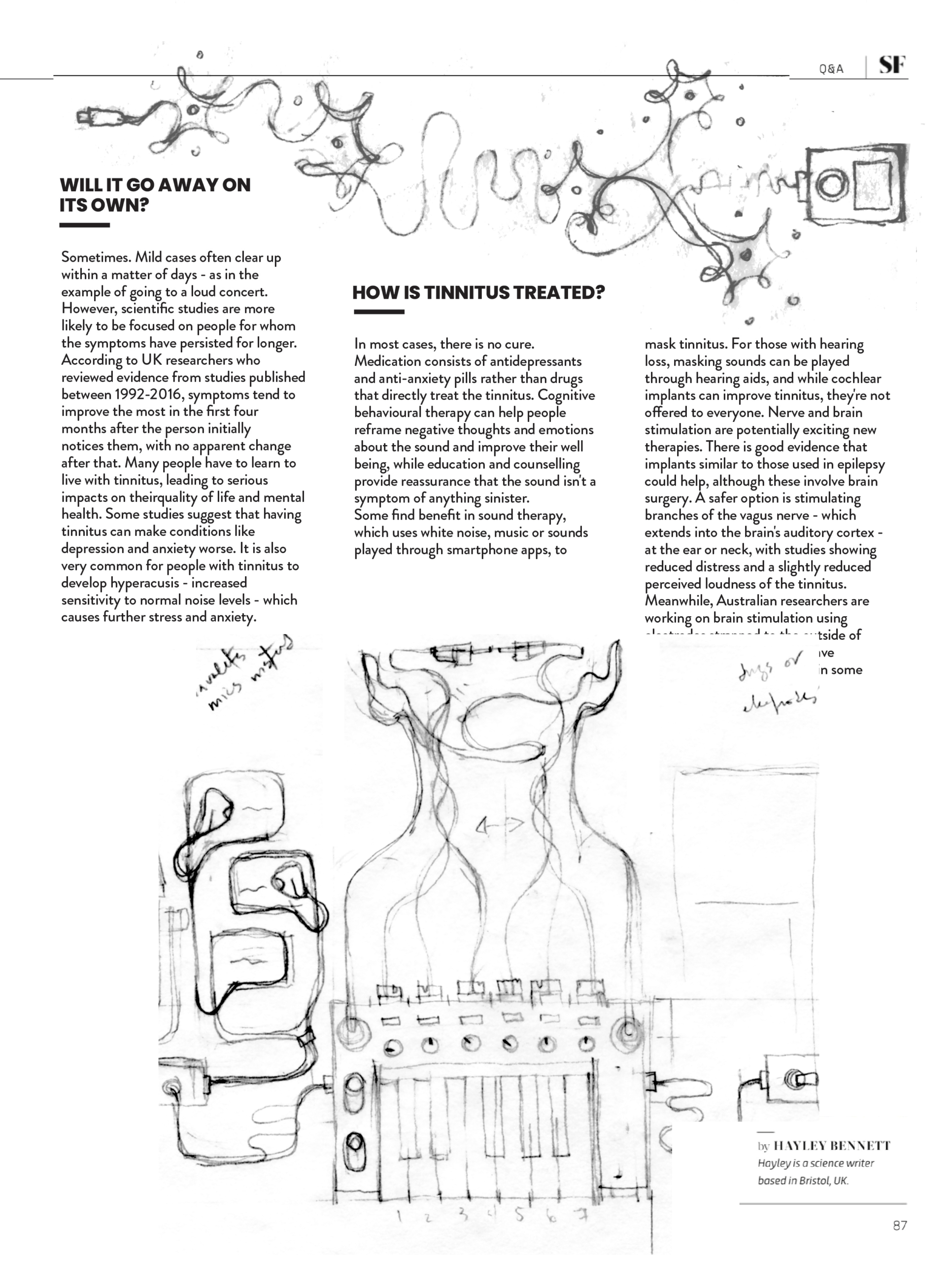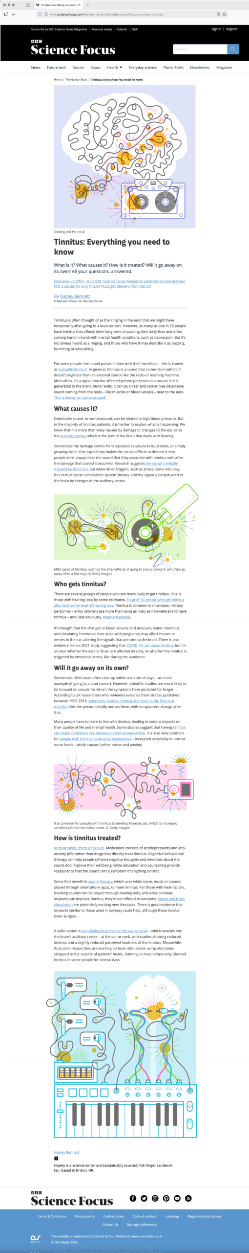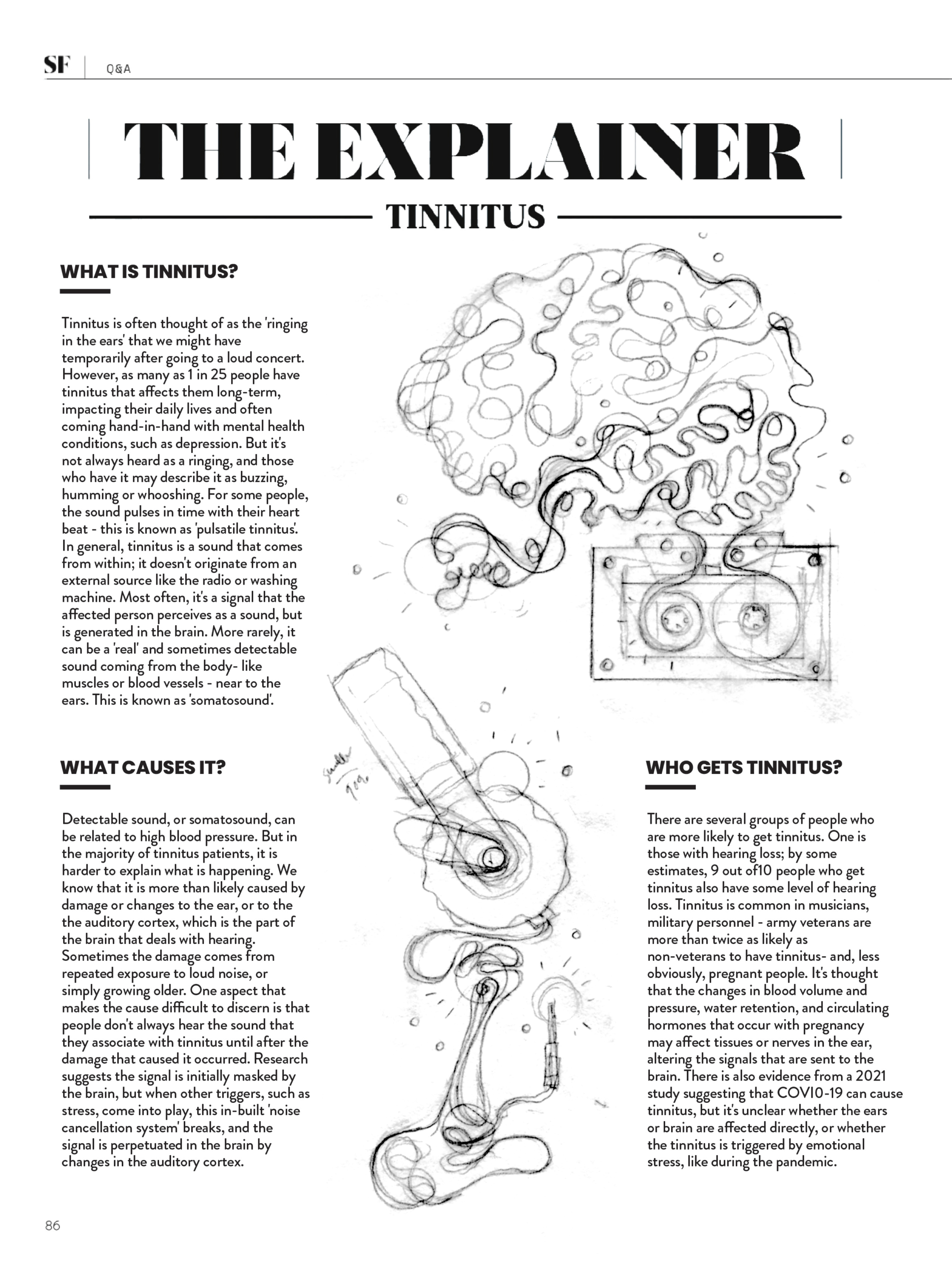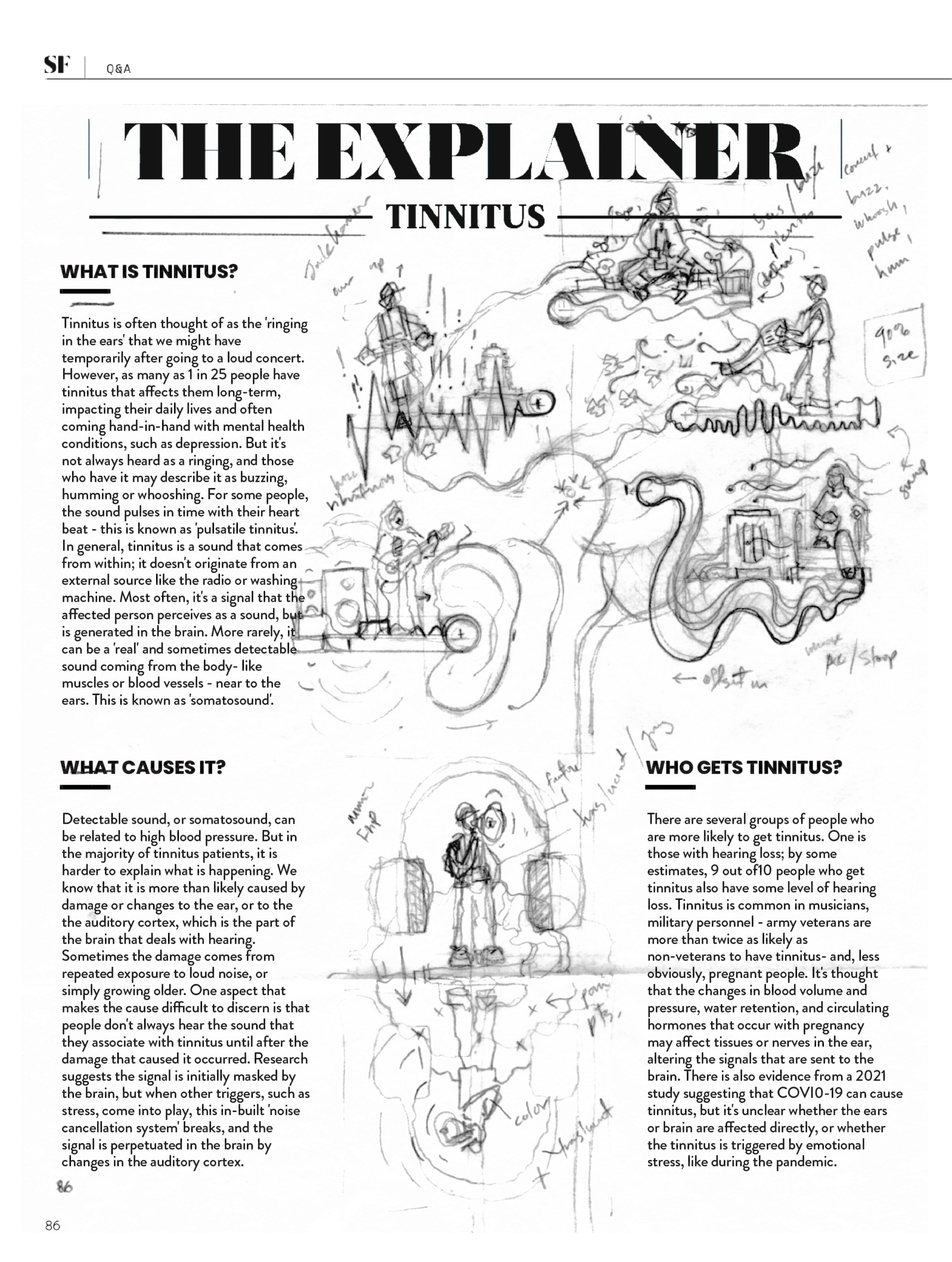 To practice making simpler, punchier editorial concepts, I developed these illustrations of audio glitches (misfirings/miswirings) as analogies for the symptoms and causes for tinnitus. The text & dual layouts (as inspiration) are from an existing BBC Science Focus ‘The Explainer’ column. (Original print article ran Oct 24, 2022; web text available here.)