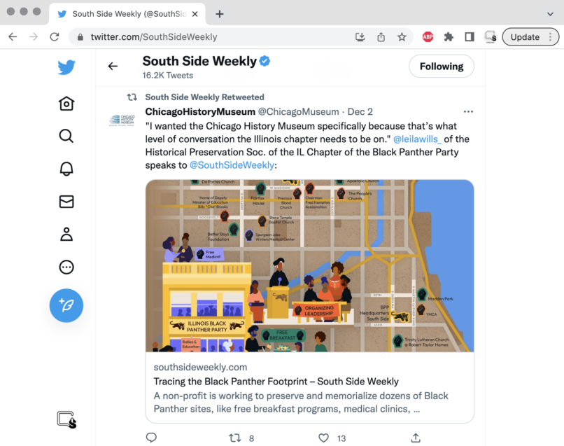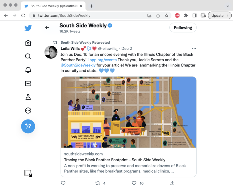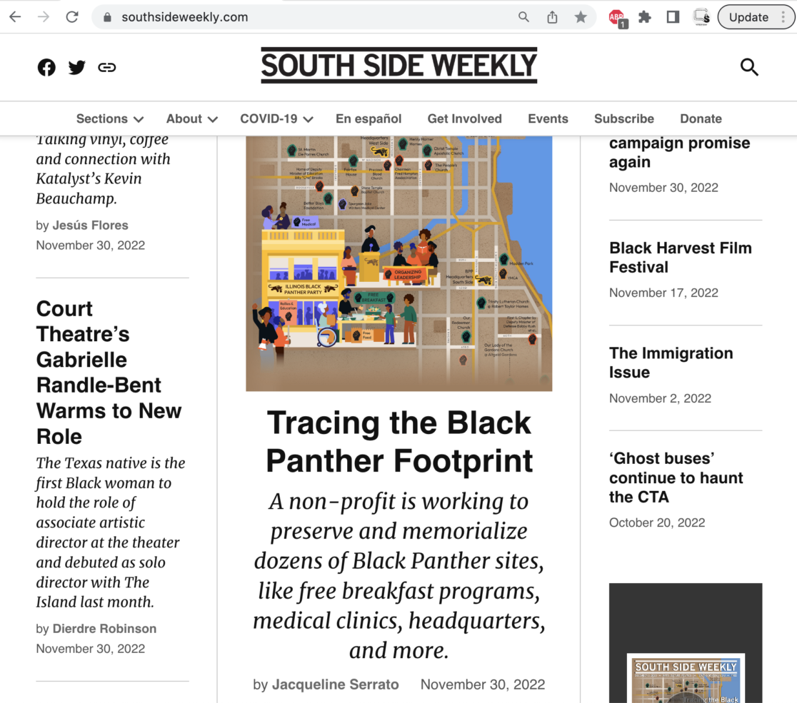 This South Side Weekly cover for December 1, 2022 consists of a Chicago map, highlighting historical Black Panther Program Sites, as surveyed for historical preservation by the Illinois Chapter of the Black Panther Party. Reporting on their efforts (and hence the cover) were published to coincide with 50th anniversary of BPP Chairman Fred Hampton’s (FBI/CPD) assassination.