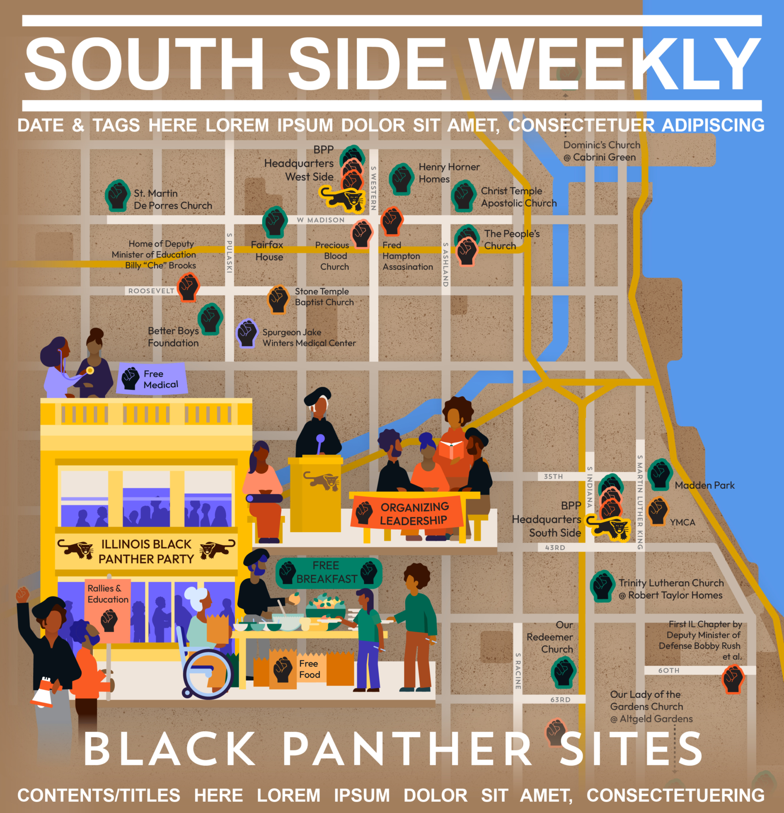 This South Side Weekly cover for December 1, 2022 consists of a Chicago map, highlighting historical Black Panther Program Sites, as surveyed for historical preservation by the Illinois Chapter of the Black Panther Party. Reporting on their efforts (and hence the cover) were published to coincide with 50th anniversary of BPP Chairman Fred Hampton’s (FBI/CPD) assassination.