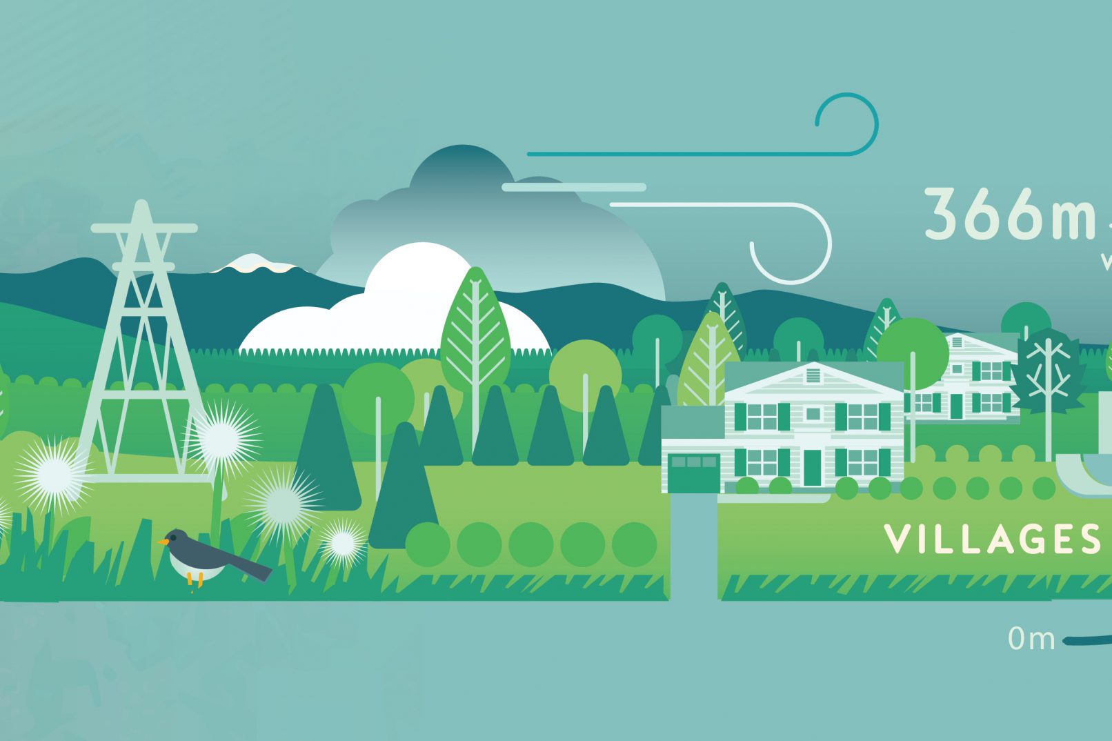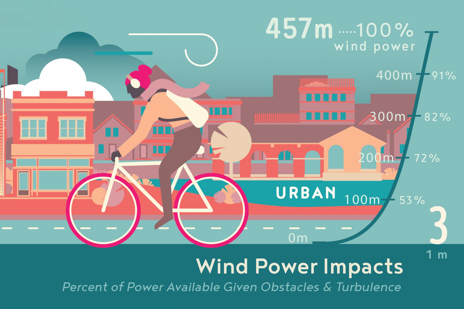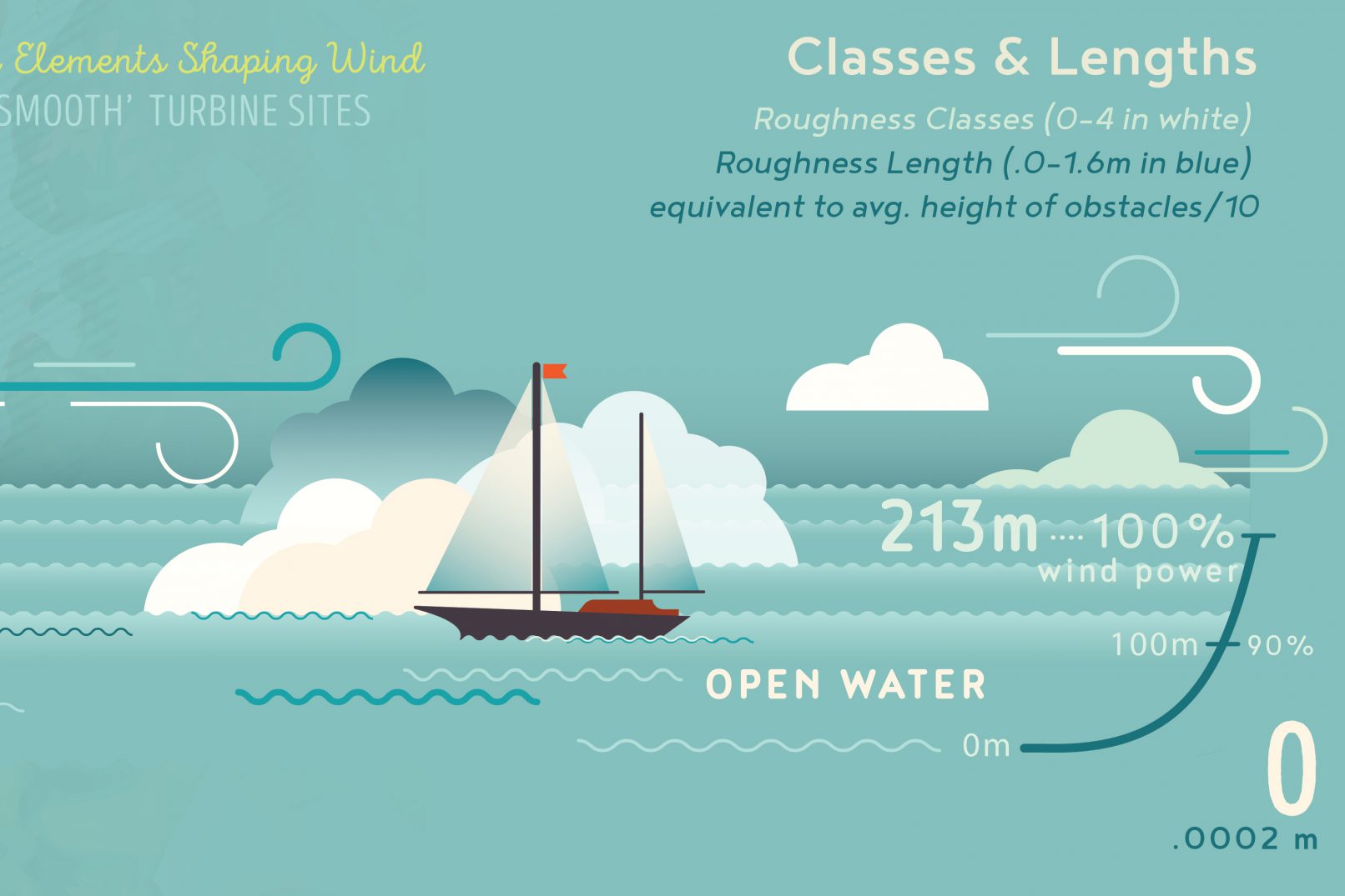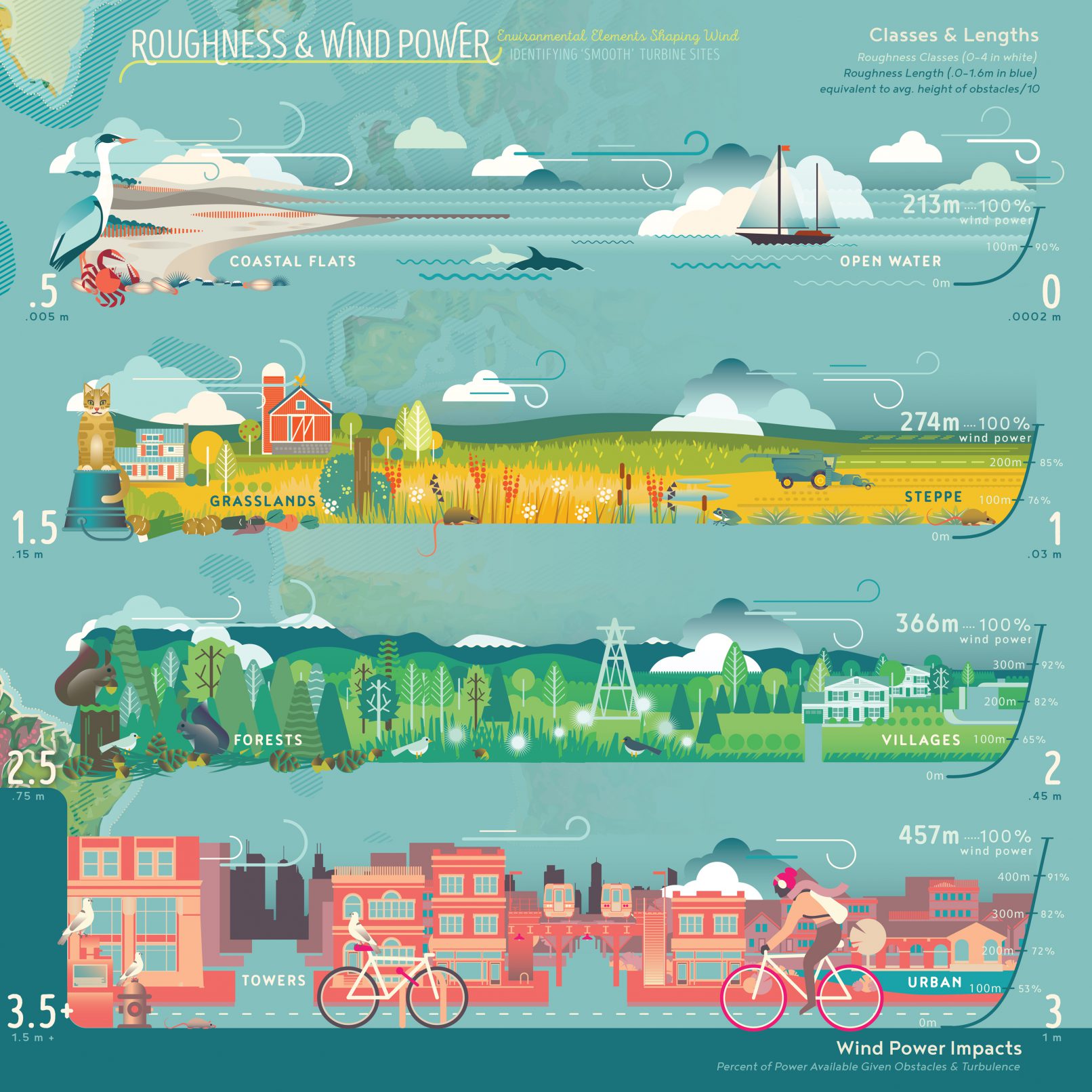 This pictorial map of the Americas uses a series of landscapes to show the interaction between wind, surface obstacles, and turbulence (called roughness).