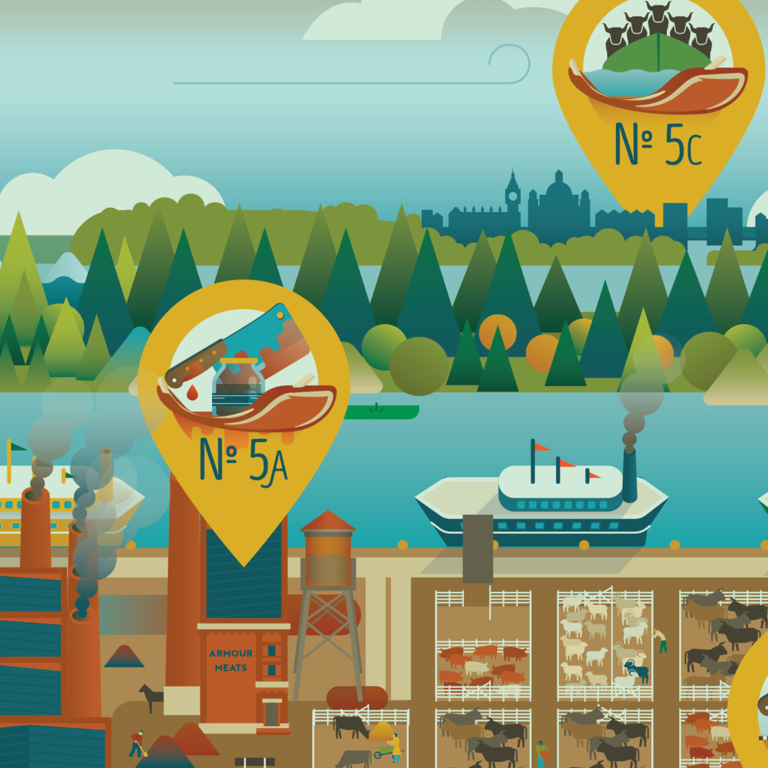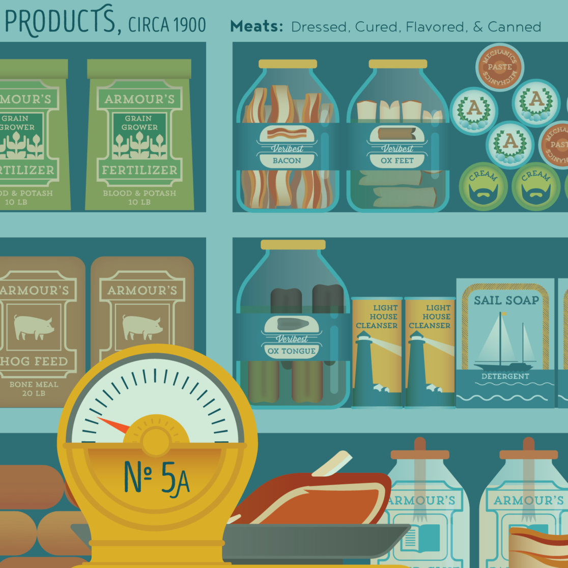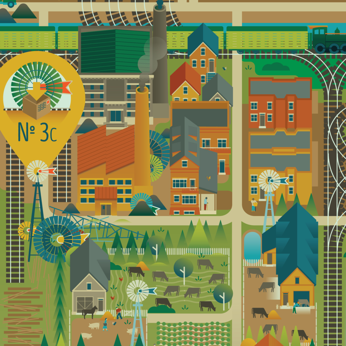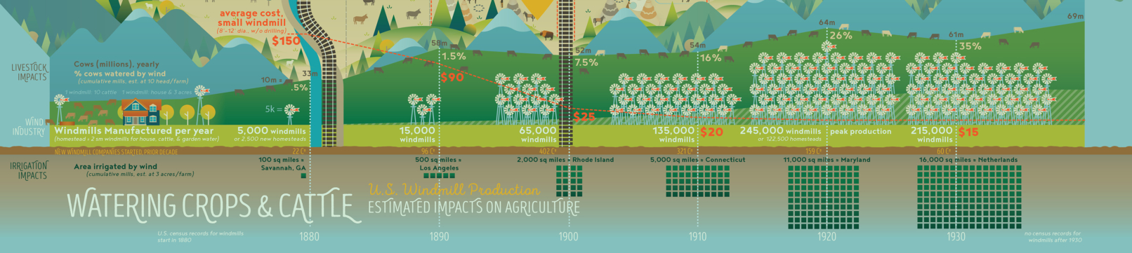 This pictorial map reaches from the Rocky Mountain foothills to Chicago around 1900, showing the types, density, and nature of wind-enabled settlement (esp. ranching) as well as its’ industrial outcomes & products (i.e. meatpacking & factory foods). Placeholder text shown.