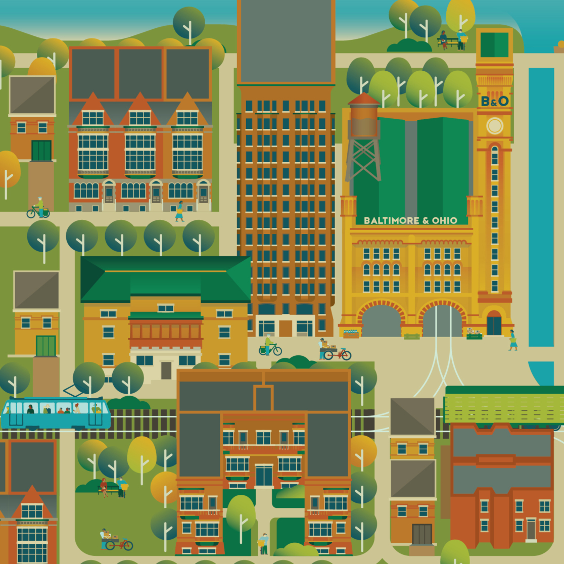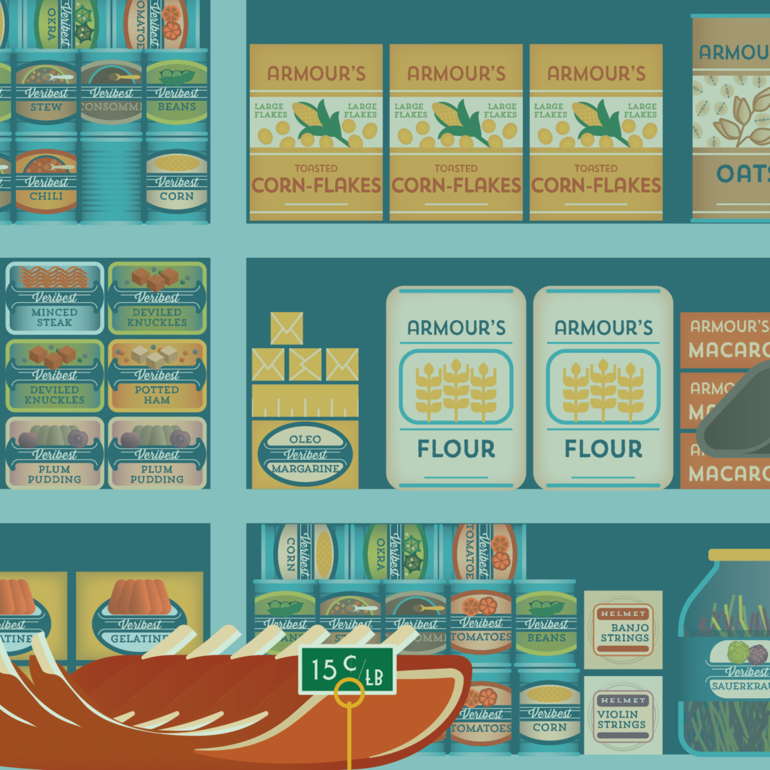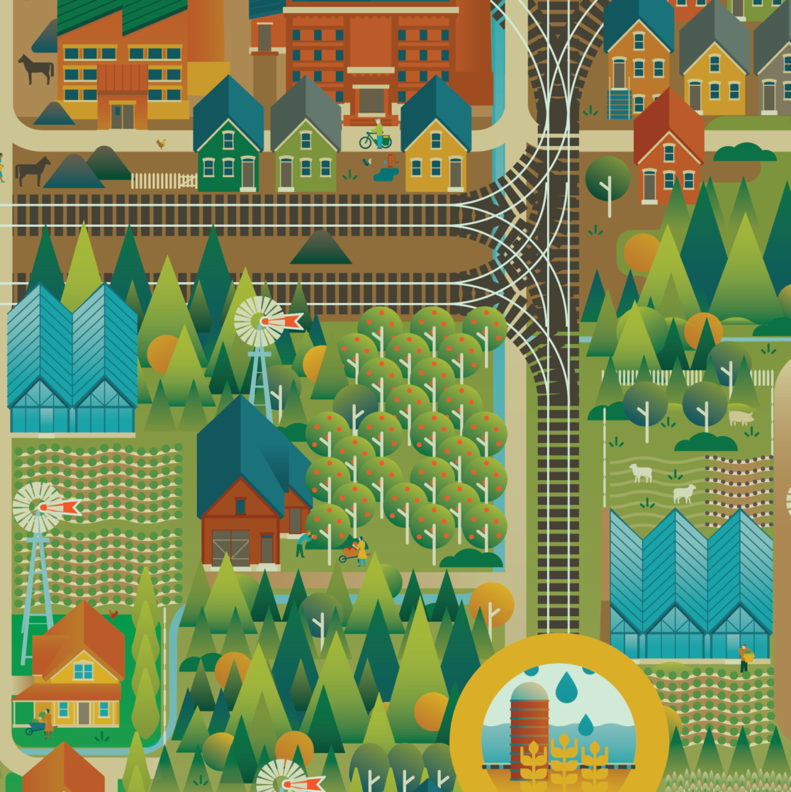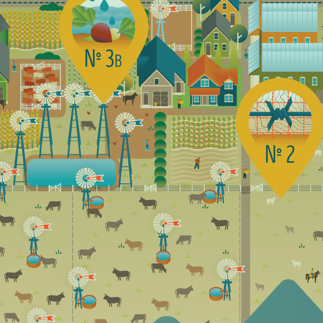 This pictorial map reaches from the Rocky Mountain foothills to Chicago around 1900, showing the types, density, and nature of wind-enabled settlement (esp. ranching) as well as its’ industrial outcomes & products (i.e. meatpacking & factory foods). Placeholder text shown.